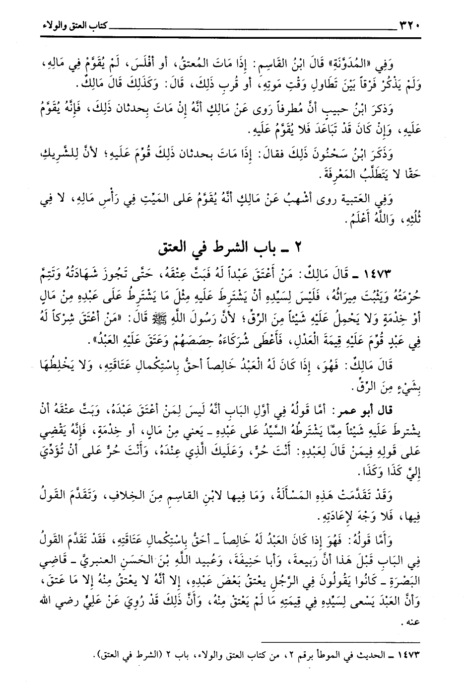 1473 - قَالَ مَالِكٌ مَنْ أَعْتَقَ عَبْدًا لَهُ فَبَتَّ عِتْقَهُ حَتَّى تَجُوزَ شَهَادَتُهُ وَتَتِمَّ حُرْمَتُهُ وَيَثْبُتَ مِيرَاثُهُ فَلَيْسَ لِسَيِّدِهِ أَنْ يَشْتَرِطَ عَلَيْهِ مِثْلَ مَا يُشْتَرَطُ عَلَى عَبْدِهِ مِنْ مَالٍ أَوْ خِدْمَةٍ وَلَا يَحْمِلُ عَلَيْهِ شَيْئًا مِنَ الرِّقِّ لِأَنَّ رَسُولَ اللَّهِ صَلَّى اللَّهُ عَلَيْهِ وَسَلَّمَ قَالَ (مَنْ أَعْتَقَ شِرْكًا لَهُ) فِي عَبْدٍ قُوِّمَ عَلَيْهِ قِيمَةُ الْعَدْلِ فَأَعْطَى شُرَكَاءَهُ حِصَصَهُمْ وَعَتَقَ عَلَيْهِ الْعَبْدُ)