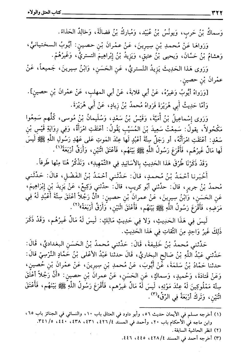 حَدَّثَنِي مُحَمَّدُ بْنُ خَلِيفَةَ قَالَ حَدَّثَنِي مُحَمَّدُ بْنُ الْحَسَنِ الْبَغْدَادِيُّ قَالَ حَدَّثَنِي عَبْدُ اللَّهِ بْنُ صَالِحٍ الْبُخَارِيُّ قَالَ حَدَّثَنَا عَبْدُ الْأَعْلَى بْنُ حَمَّادٍ النَّرْسِيُّ قَالَ حَدَّثَنَا حَمَّادُ بْنُ سَلَمَةَ عَنْ أَيُّوبَ عَنْ مُحَمَّدِ بْنِ سِيرِينَ عَنْ عِمْرَانَ بْنِ حُصَيْنٍ وَعَنْ قَتَادَةَ وَحُمَيْدٍ وَسِمَاكٍ عَنِ الْحَسَنِ عَنْ عِمْرَانَ بْنِ حُصَيْنٍ (أَنَّ رَجُلًا أَعْتَقَ سِتَّةَ مَمْلُوكِينَ لَهُ عِنْدَ مَوْتِهِ لَيْسَ لَهُ مَالٌ غَيْرُهُمْ فَأَقْرَعُ رَسُولُ اللَّهِ صَلَّى اللَّهُ عَلَيْهِ وَسَلَّمَ بَيْنَهُمْ فَأَعْتَقَ اثْنَيْنِ وَتَرَكَ أَرْبَعَةً فِي الرِّقِّ