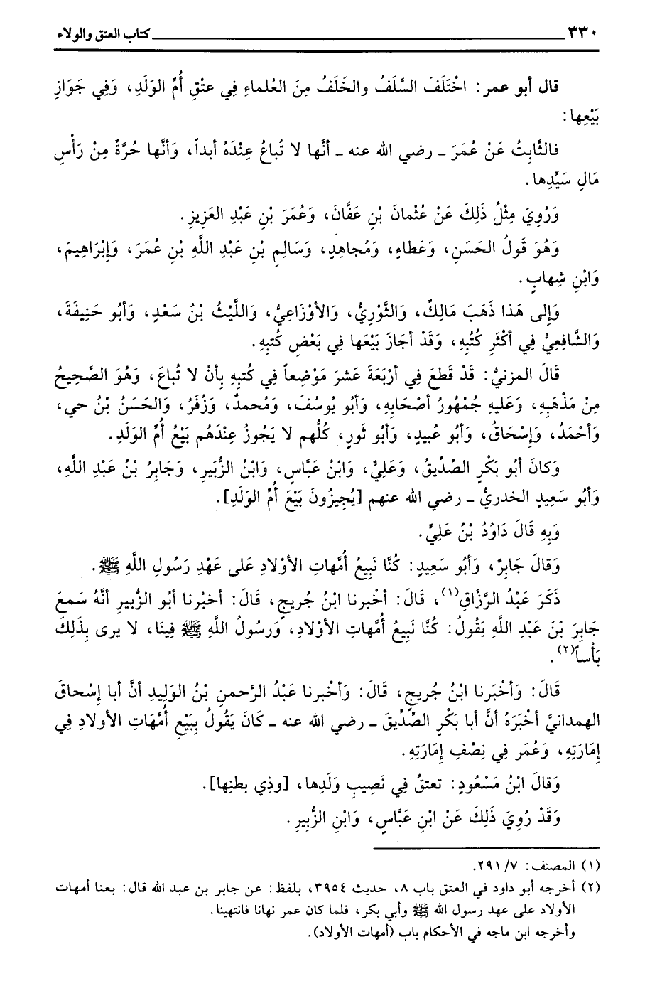 قَالَ أَبُو عُمَرَ اخْتَلَفَ السَّلَفُ وَالْخَلْفُ مِنَ الْعُلَمَاءِ فِي عِتْقِ أُمِّ الْوَلَدِ وَفِي جَوَازِ بَيْعِهَا
