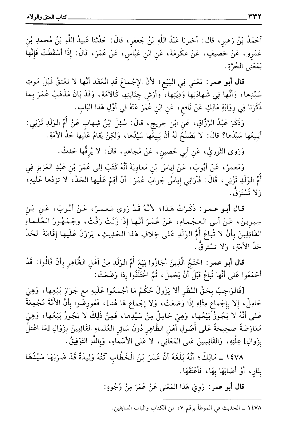 قَالَ أَبُو عُمَرَ ذَكَرْتُ هَذَا لِأَنَّهُ قَدْ رَوَى معمر عن ايوب عن بن سِيرِينَ عَنْ أَبِي الْعَجْمَاءِ عَنْ عُمَرَ أَنَّهَا إِذَا زَنَتْ رُقَّتْ وَجُمْهُورُ الْعُلَمَاءِ الْقَائِلِينَ بِأَنْ لَا تُبَاعَ أُمُّ الْوَلَدِ عَلَى خِلَافِ هَذَا الْحَدِيثِ يَرَوْنَ عَلَيْهَا إِقَامَةَ الْحَدِّ حَدِّ الْأَمَةِ وَلَا تُسْتَرَقُّ
