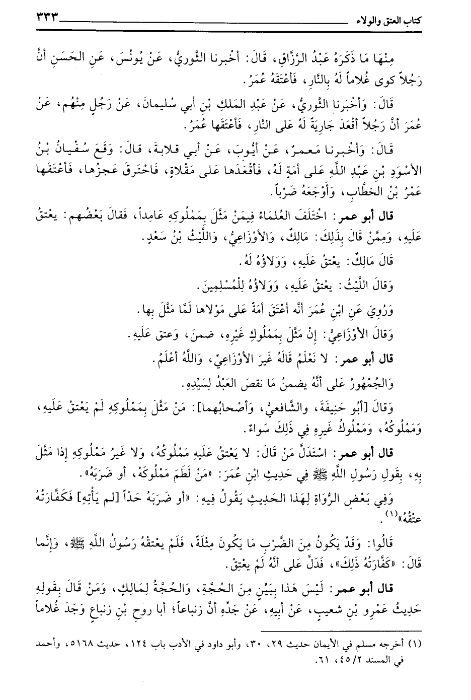 قَالَ أَبُو عُمَرَ اسْتَدَلَّ مَنْ قَالَ لَا يَعْتِقُ عَلَيْهِ مَمْلُوكُهُ وَلَا غَيْرُ مَمْلُوكِهِ إِذَا مَثَّلَ بِهِ بِقَوْلِ رَسُولِ اللَّهِ صَلَّى اللَّهُ عَلَيْهِ وَسَلَّمَ في حديث بن عُمَرَ (مَنْ لَطَمَ مَمْلُوكَهُ أَوْ ضَرَبَهُ)