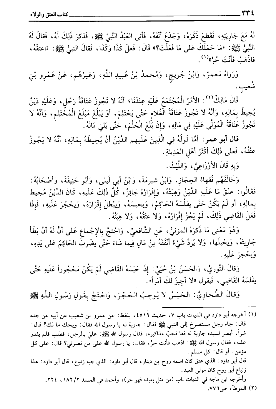 قَالَ أَبُو عُمَرَ أَمَّا قَوْلُهُ فِي الَّذِينَ عَلَيْهِمُ الدَّيْنُ أَنْ يُحِيطَهُ بِمَالِهِ أَنَّهُ لَا يَجُوزُ عِتْقُهُ فَعَلَى ذَلِكَ أَكْثَرُ أَهْلِ الْمَدِينَةِ