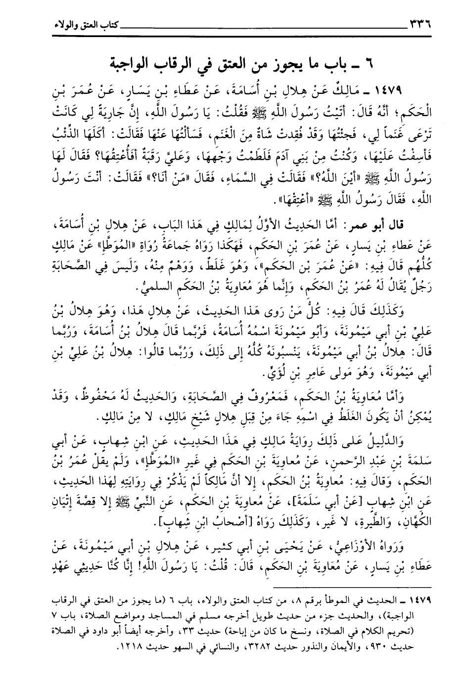 1479 - مَالِكٌ عَنْ هِلَالِ بْنِ أُسَامَةَ عَنْ عَطَاءِ بْنِ يَسَارٍ عَنْ عُمَرَ بْنِ الْحَكَمِ أَنَّهُ قَالَ أَتَيْتُ رَسُولَ اللَّهِ صَلَّى اللَّهُ عَلَيْهِ وَسَلَّمَ فَقُلْتُ يَا رَسُولَ اللَّهِ إِنَّ لي جارية كَانَتْ تَرْعَى غَنَمًا لِي فَجِئْتُهَا وَقَدْ فُقِدَتْ شَاةٌ مِنَ الْغَنَمِ فَسَأَلْتُهَا عَنْهَا فَقَالَتْ أَكَلَهَا الذِّئْبُ فَأَسِفْتُ عَلَيْهَا وَكُنْتُ مِنْ بَنِي آدَمَ فَلَطَمْتُ وَجْهَهَا وَعَلَيَّ رَقَبَةٌ أَفَأَعْتِقُهَا فَقَالَ لَهَا رَسُولُ اللَّهِ صَلَّى اللَّهُ عَلَيْهِ وَسَلَّمَ (أَيْنَ اللَّهُ) فَقَالَتْ فِي السَّمَاءِ فَقَالَ (مَنْ أَنَا) فَقَالَتْ أَنْتَ رَسُولَ اللَّهِ فَقَالَ رَسُولُ اللَّهِ صَلَّى اللَّهُ عَلَيْهِ وَسَلَّمَ (أَعْتِقْهَا)