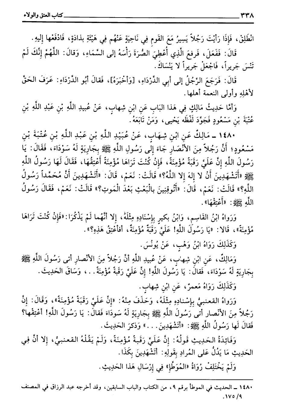 1480 - مالك عن بن شِهَابٍ عَنْ عُبَيْدِ اللَّهِ بْنِ عَبْدِ اللَّهِ بن عتبة بن مسعود ان رجلا من الانصار جَاءَ إِلَى رَسُولِ اللَّهِ صَلَّى اللَّهُ عَلَيْهِ وَسَلَّمَ بِجَارِيَةٍ لَهُ سَوْدَاءَ فَقَالَ يَا رَسُولَ اللَّهِ إِنَّ عَلَيَّ رَقَبَةً مُؤْمِنَةً فَإِنْ كُنْتَ تراها مؤمنة أَعْتِقُهَا فَقَالَ لَهَا رَسُولُ اللَّهِ صَلَّى اللَّهُ عَلَيْهِ وَسَلَّمَ (اتشهدين ان لا اله الا الله) قالت نعم قال (اتشهدين ان محمدا رسول الله) قالت نعم قال (اتوقنين بالبعث بعد الموت) قالت نَعَمْ فَقَالَ رَسُولُ اللَّهِ صَلَّى اللَّهُ عَلَيْهِ وَسَلَّمَ (اعتقها)