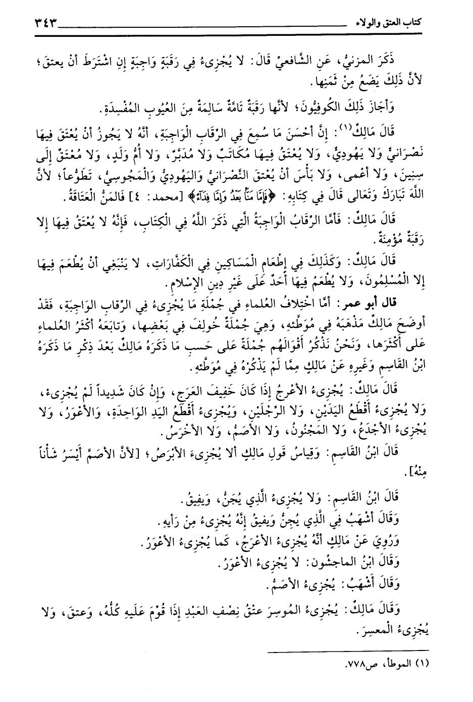 قَالَ أَبُو عُمَرَ أَمَّا اخْتِلَافُ الْعُلَمَاءِ فِي جُمْلَةِ مَا يُجْزِئُ فِي الرِّقَابِ الْوَاجِبَةِ فَقَدْ اوضح مالك مذهبه في موطئه وَهِيَ جُمْلَةٌ خُولِفَ فِي بَعْضِهَا وَتَابَعَهُ أَكْثَرُ الْعُلَمَاءِ عَلَى أَكْثَرِهَا وَنَحْنُ نَذْكُرُ أَقْوَالَهُمْ جُمْلَةً عَلَى حَسَبِ مَا ذَكَرَهُ مَالِكٌ بَعْدَ ذِكْرِ ما ذكره بن الْقَاسِمِ وَغَيْرُهُ عَنْ مَالِكٍ مِمَّا لَمْ يَذْكُرْهُ فِي مُوَطَّئِهِ