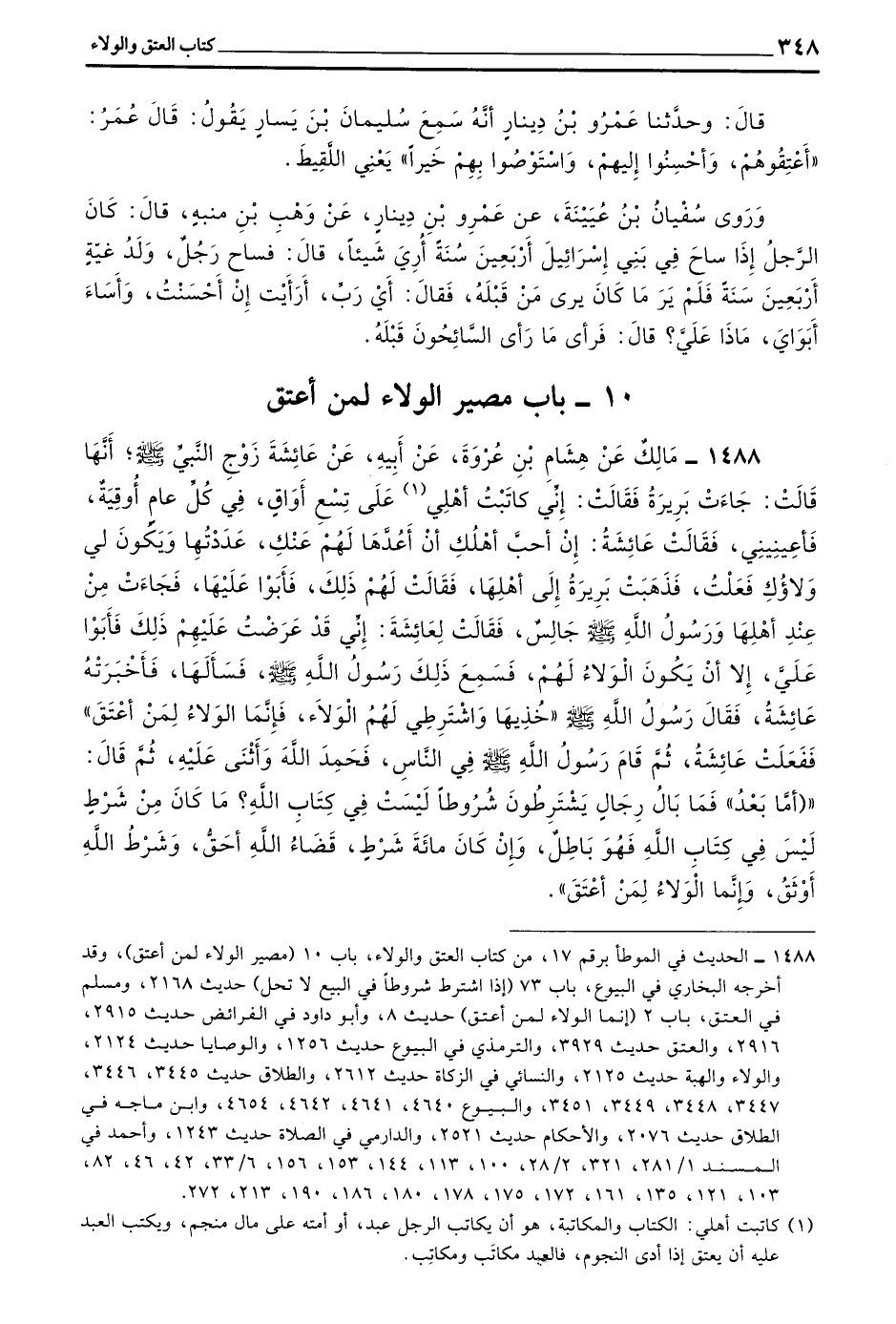 1488 - مَالِكٌ عَنْ هِشَامِ بْنِ عُرْوَةَ عَنْ أَبِيهِ عَنْ عَائِشَةَ زَوْجِ النَّبِيِّ صَلَّى اللَّهُ عَلَيْهِ وَسَلَّمَ أَنَّهَا قَالَتْ جَاءَتْ بَرِيرَةُ فَقَالَتْ إِنِّي كَاتَبْتُ أَهْلِي عَلَى تِسْعِ أواق في كل عام أوقية فأعينيني فقالت عائشة إن أحب أهلك أن أعدها لهم عَنْكِ عَدَدْتُهَا وَيَكُونُ لِي وَلَاؤُكِ فَعَلْتُ فَذَهَبَتْ بَرِيرَةُ إِلَى أَهْلِهَا فَقَالَتْ لَهُمْ ذَلِكَ فَأَبَوْا عَلَيْهَا فَجَاءَتْ مِنْ عِنْدِ أَهْلِهَا وَرَسُولُ اللَّهِ صَلَّى اللَّهُ عَلَيْهِ وَسَلَّمَ جَالِسٌ فَقَالَتْ لِعَائِشَةَ إِنِّي قَدْ عَرَضْتُ عَلَيْهِمْ ذَلِكَ فَأَبَوْا عَلَيَّ إِلَّا أَنْ يَكُونَ الْوَلَاءُ لَهُمْ فَسَمِعَ ذَلِكَ رَسُولَ اللَّهِ صَلَّى اللَّهُ عَلَيْهِ وَسَلَّمَ فَسَأَلَهَا فَأَخْبَرَتْهُ عَائِشَةُ فَقَالَ رَسُولُ اللَّهِ صَلَّى اللَّهُ عَلَيْهِ وَسَلَّمَ خُذِيهَا وَاشْتَرِطِي لَهُمُ الْوَلَاءَ فَإِنَّمَا الْوَلَاءُ لِمَنْ أَعْتَقَ فَفَعَلَتْ عَائِشَةُ ثُمَّ قَامَ رَسُولُ اللَّهِ صَلَّى اللَّهُ عَلَيْهِ وَسَلَّمَ في النَّاسَ فَحَمِدَ اللَّهَ وَأَثْنَى عَلَيْهِ ثُمَّ قَالَ (أَمَّا بَعْدُ) فَمَا بَالُ رِجَالٍ يَشْتَرِطُونَ شُرُوطًا لَيْسَتْ فِي كِتَابِ اللَّهِ مَا كَانَ مِنْ شَرْطٍ لَيْسَ فِي كِتَابِ اللَّهِ فَهُوَ بَاطِلٌ وَإِنْ كَانَ مِائَةَ شَرْطٍ قَضَاءُ اللَّهِ أَحَقُّ وَشَرْطُ اللَّهِ أَوْثَقُ وَإِنَّمَا الْوَلَاءُ لِمَنْ أَعْتَقَ