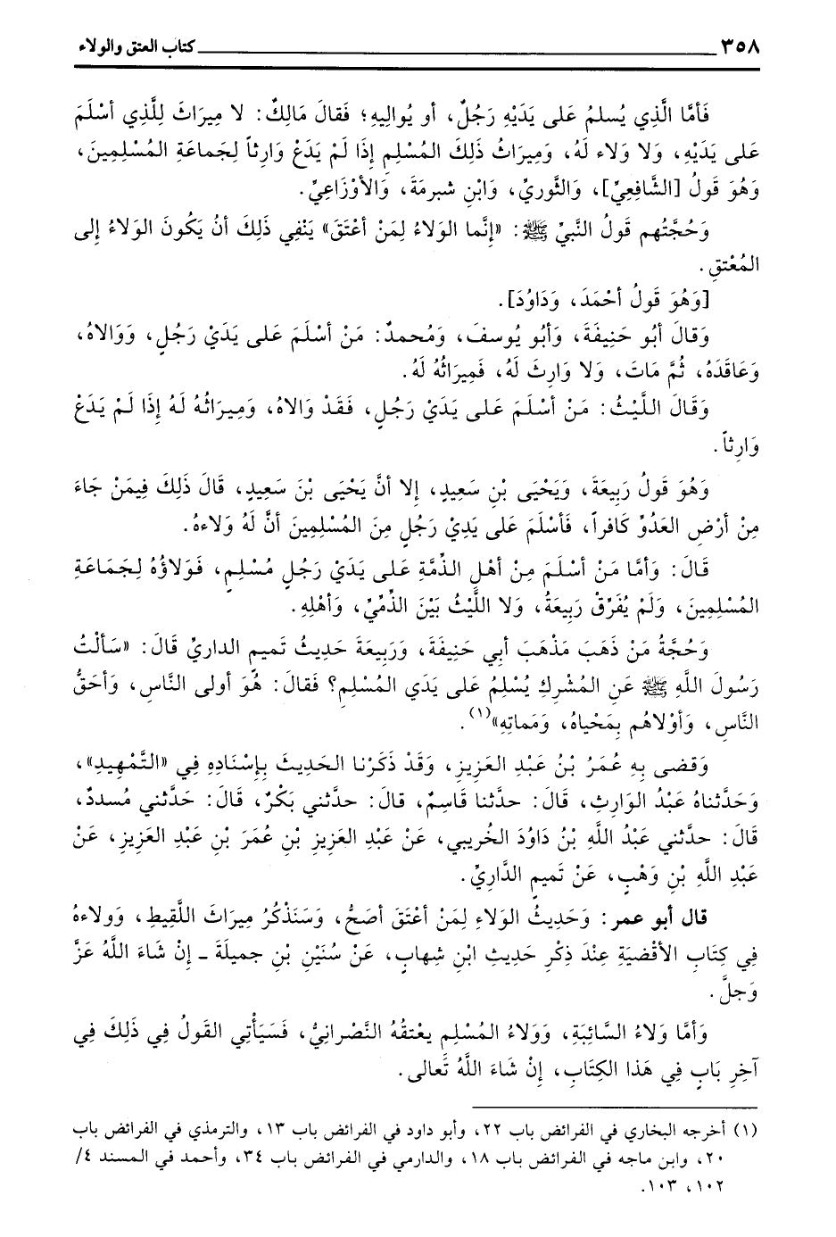 وَحُجَّةُ مَنْ ذَهَبَ مَذْهَبَ أَبِي حَنِيفَةَ وَرَبِيعَةَ حَدِيثُ تَمِيمٍ الدَّارِيِّ قَالَ (سَأَلْتُ رَسُولَ اللَّهِ صَلَّى اللَّهُ عَلَيْهِ وَسَلَّمَ عَنِ الْمُشْرِكِ يُسْلِمُ عَلَى يَدَيِ الْمُسْلِمِ فَقَالَ هُوَ أَوْلَى النَّاسِ وَأَحَقُّ النَّاسِ وَأَوْلَاهُمْ بِمَحْيَاهُ وَمَمَاتِهِ)