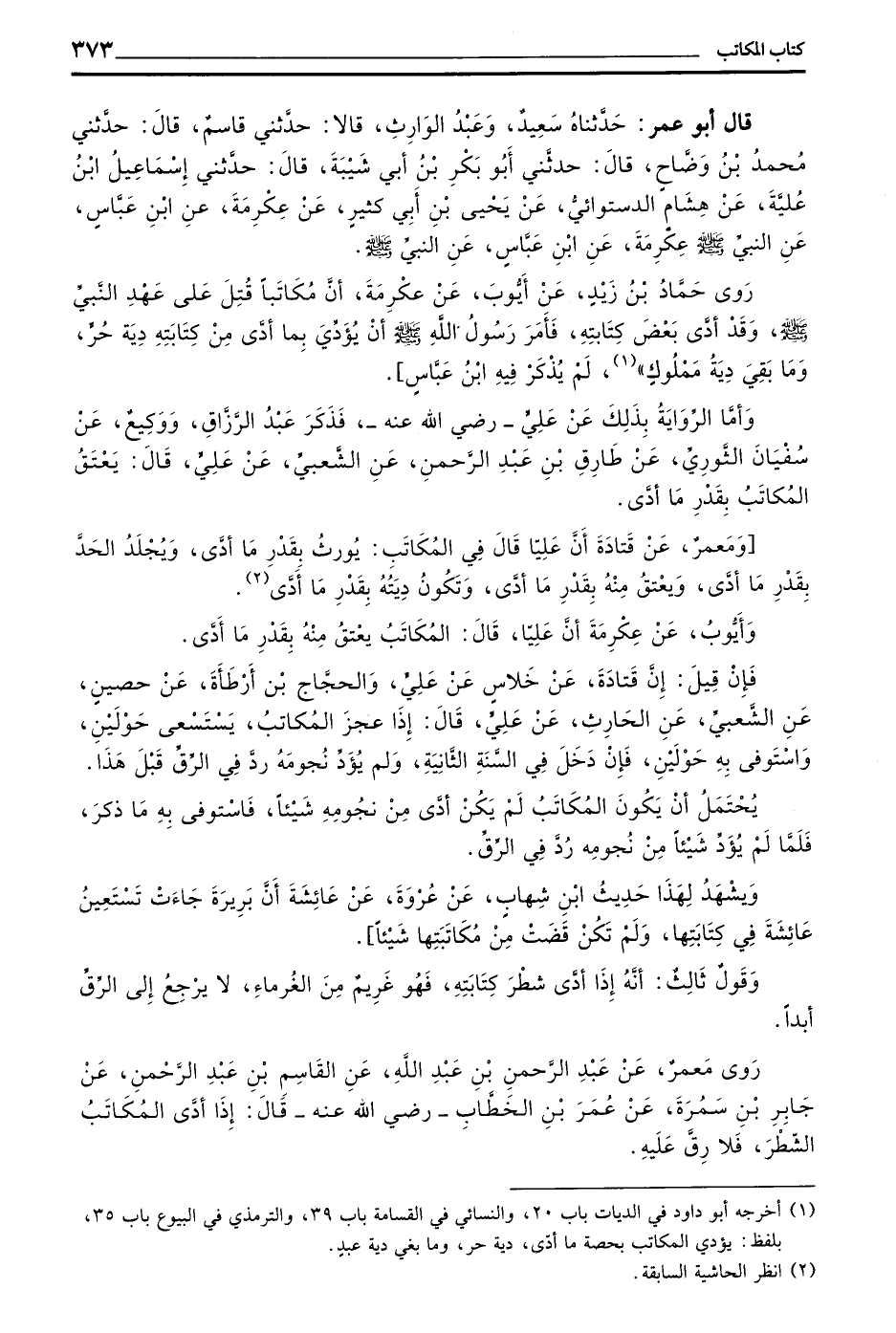 رَوَى حَمَّادُ بْنُ زَيْدٍ عَنْ أَيُّوبَ عَنْ عِكْرِمَةَ أَنَّ مُكَاتَبًا قُتِلَ عَلَى عَهْدِ النَّبِيِّ صَلَّى اللَّهُ عَلَيْهِ وَسَلَّمَ وَقَدْ أَدَّى بَعْضَ كِتَابَتِهِ فَأَمَرَ رَسُولُ اللَّهِ صَلَّى اللَّهُ عَلَيْهِ وَسَلَّمَ أَنْ يُؤَدِّيَ بِمَا أَدَّى مِنْ كِتَابَتِهِ دِيَةَ حُرٍّ وَمَا بَقِيَ دِيَةَ مَمْلُوكٍ) لَمْ يذكر فيه بن عَبَّاسٍ