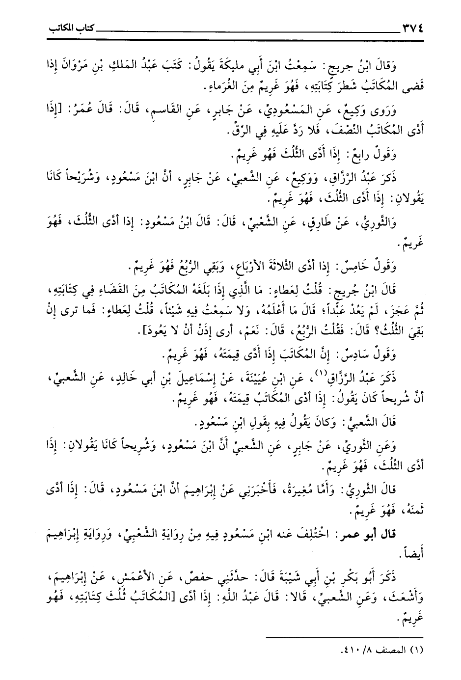 ذكر عبد الرزاق عن بْنُ عُيَيْنَةَ عَنْ إِسْمَاعِيلَ بْنِ أَبِي خَالِدٍ عَنِ الشَّعْبِيِّ أَنْ شُرَيْحًا كَانَ يَقُولُ إِذَا أَدَّى الْمُكَاتَبُ قِيمَتَهُ فَهُوَ غَرِيمٌ
