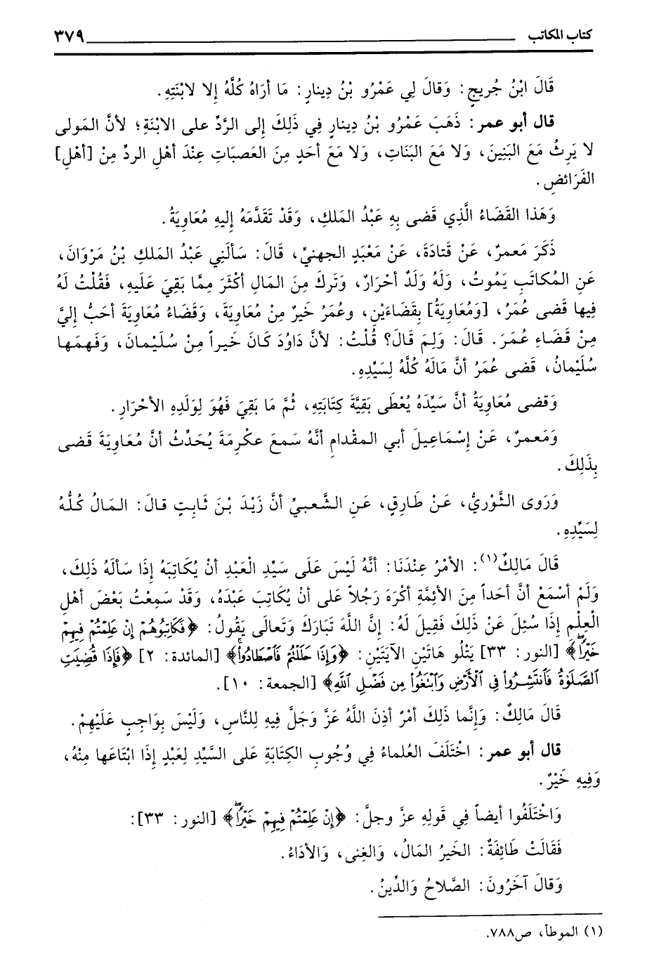 قَالَ مَالِكٌ الْأَمْرُ عِنْدَنَا أَنَّهُ لَيْسَ عَلَى سَيِّدِ الْعَبْدِ أَنْ يُكَاتِبَهُ إِذَا سَأَلَهُ ذَلِكَ وَلَمْ أَسْمَعْ أَنَّ أَحَدًا مِنَ الْأَئِمَّةِ أَكْرَهَ رَجُلًا عَلَى أَنْ يُكَاتِبَ عَبْدَهُ وَقَدْ سَمِعْتُ بَعْضَ أَهْلِ الْعِلْمِ إِذَا سُئِلَ عَنْ ذَلِكَ فَقِيلَ لَهُ إِنَّ اللَّهَ تَبَارَكَ وَتَعَالَى يَقُولُ (فَكَاتِبُوهُمْ إِنْ عَلِمْتُمْ فِيهِمْ خَيْرًا) النُّورِ 33 يَتْلُو هَاتَيْنِ الْآيَتَيْنِ (وَإِذَا حَلَلْتُمْ فَاصْطَادُوا) الْمَائِدَةِ 2 (فَإِذَا قُضِيَتِ الصَّلَاةُ فَانْتَشِرُوا فِي الْأَرْضِ وَابْتَغُوا مِنْ فَضْلِ اللَّهِ) الْجُمُعَةِ 10