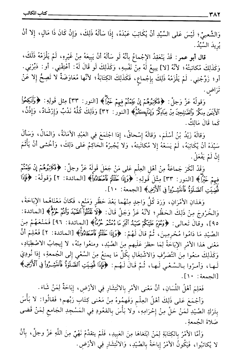 وَقَوْلُهُ عَزَّ وَجَلَّ (فَكَاتِبُوهُمْ إِنْ عَلِمْتُمْ فِيهِمْ خَيْرًا) النُّورِ 33 مِثْلُ قَوْلِهِ (وَأَنْكِحُوا الْأَيَامَى مِنْكُمْ وَالصَّالِحِينَ مِنْ عِبَادِكُمْ وَإِمَائِكُمْ) النُّورِ 32 وَذَلِكَ كُلُّهُ نَدْبٌ وَإِرْشَادٌ وَإِذْنٌ كَمَا قَالَ مَالِكٌ