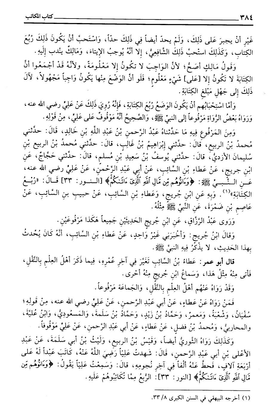 وَمِنَ الْمَرْفُوعِ فِيهِ مَا حَدَّثَنَاهُ عَبْدِ الرَّحْمَنِ بْنِ عَبْدِ اللَّهِ بْنِ خَالِدٍ قَالَ حَدَّثَنِي مُحَمَّدُ بْنُ الرَّبِيعِ قَالَ حَدَّثَنِي إِبْرَاهِيمُ بْنُ غَالِبٍ قَالَ حَدَّثَنِي مُحَمَّدُ بْنُ الرَّبِيعِ بْنِ سُلَيْمَانَ الْأَزْدِيُّ قَالَ حَدَّثَنِي يُوسُفُ بْنُ سَعِيدِ بْنِ مُسْلِمٍ قَالَ حَدَّثَنِي حَجَّاجٌ عَنِ بن جُرَيْجٍ عَنْ عَطَاءِ بْنِ السَّائِبِ عَنْ أَبِي عَبْدِ الرَّحْمَنِ عَنْ عَلِيٍّ رَضِيَ اللَّهُ عَنْهُ عَنِ النَّبِيِّ - (وءاتوهم من مال الله الذي ءاتاكم) النور 33 قال (ربع الكتابة) وبه عن بن جُرَيْجٍ وَعَطَاءِ بْنِ السَّائِبِ عَنْ حَبِيبِ بْنِ السَّائِبِ عَنْ عَاصِمِ بْنِ ضَمْرَةَ عَنِ النَّبِيِّ صَلَّى اللَّهُ عَلَيْهِ وَسَلَّمَ مِثْلَهُ