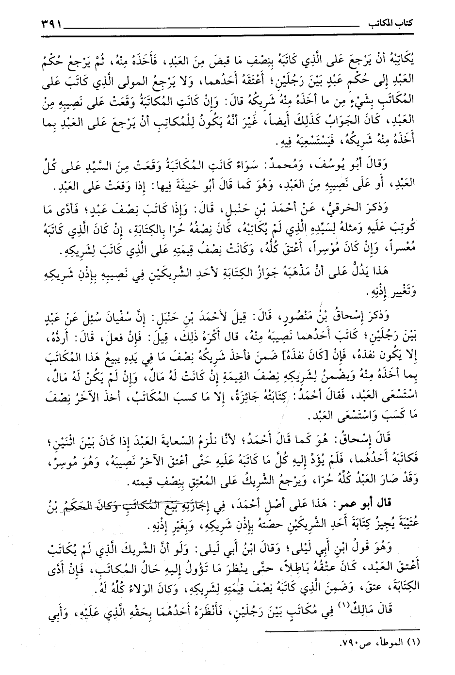 قَالَ أَبُو عُمَرَ هَذَا عَلَى أَصْلِ أَحْمَدَ فِي إِجَازَتِهِ بَيْعَ الْمُكَاتَبِ وَكَانَ الْحَكَمُ بْنُ عُتَيْبَةَ يُجِيزُ كِتَابَةَ أَحَدِ الشَّرِيكَيْنِ حِصَّتَهُ بِإِذْنِ شَرِيكِهِ وَبِغَيْرِ إِذْنِهِ