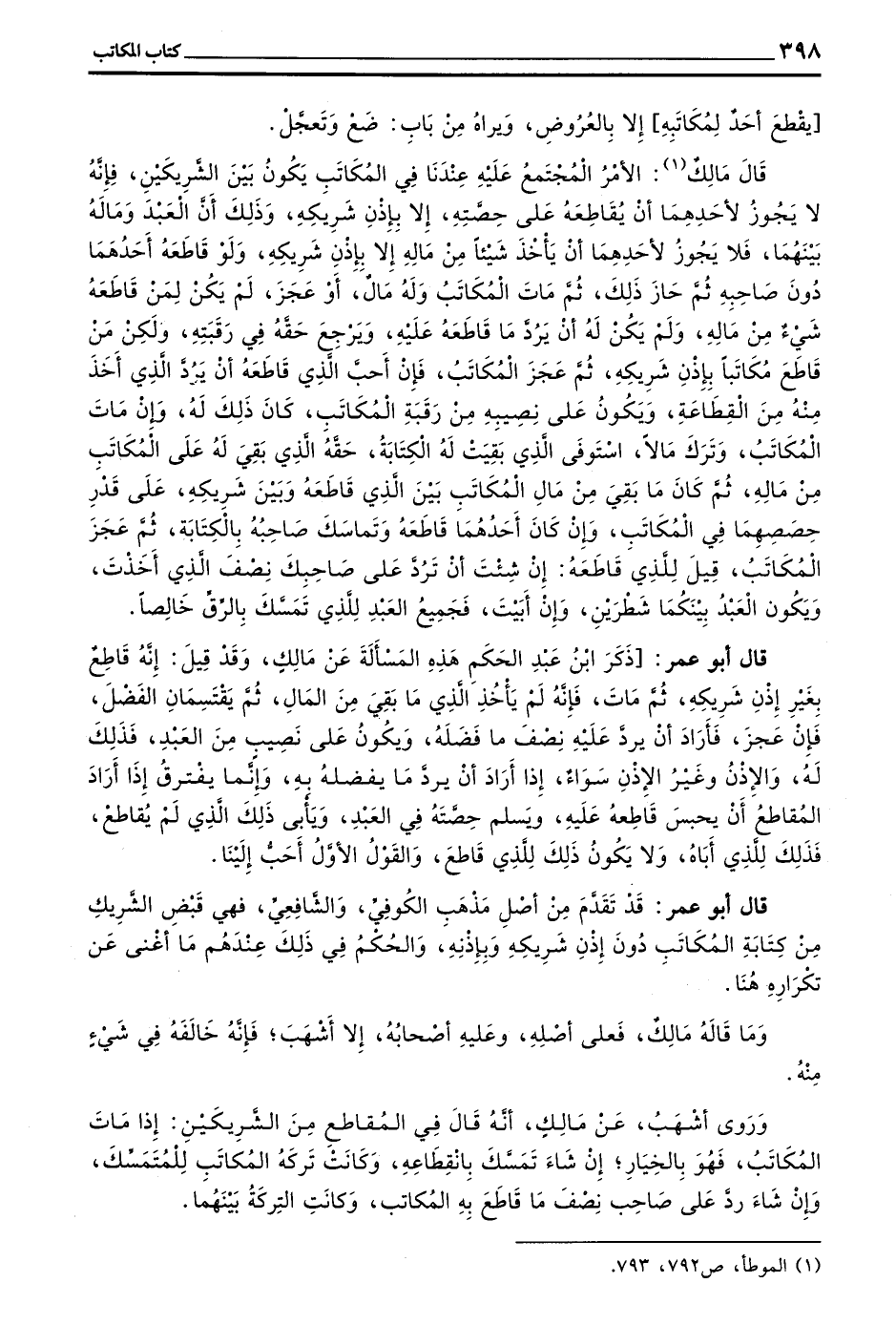 قَالَ أَبُو عُمَرَ قَدْ تَقَدَّمَ مِنْ أَصْلِ مَذْهَبِ الكوفي والشافعي فهي قَبْضِ الشَّرِيكِ مِنْ كِتَابَةِ الْمُكَاتَبِ دُونَ إِذْنِ شَرِيكِهِ وَبِإِذْنِهِ وَالْحُكْمُ فِي ذَلِكَ عِنْدَهُمْ مَا أَغْنَى عَنْ تَكْرَارِهِ هُنَا