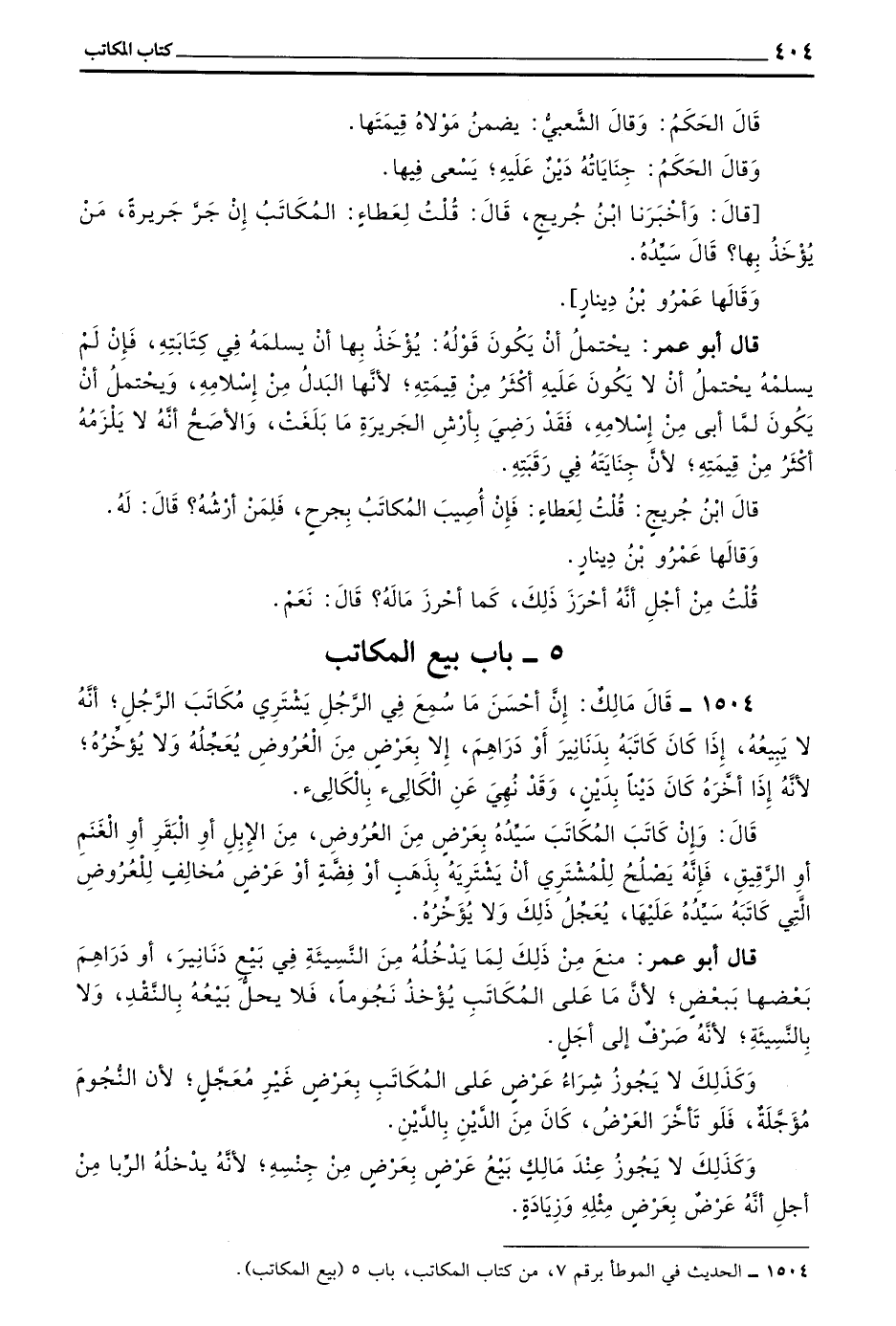 1504 - قَالَ مَالِكٌ إِنَّ أَحْسَنَ مَا سَمِعَ فِي الرَّجُلِ يَشْتَرِي مُكَاتَبَ الرَّجُلِ أَنَّهُ لَا يبيعه اذا كان كاتبه بدنانير او دراهم الا بِعَرَضٍ مِنَ الْعُرُوضِ يُعَجِّلُهُ وَلَا يُؤَخِّرُهُ لِأَنَّهُ إِذَا أَخَّرَهُ كَانَ دَيْنًا بِدَيْنٍ وَقَدْ نُهِيَ عن الكالىء بالكالىء
