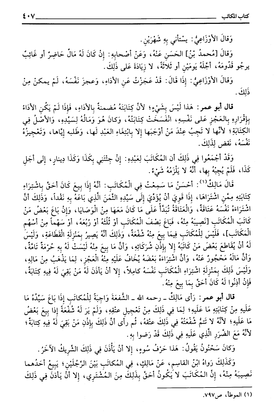 قَالَ أَبُو عُمَرَ رَأَى مَالِكٌ - رَحِمَهُ اللَّهُ - الشُّفْعَةَ وَاجِبَةً لِلْمُكَاتَبِ إِذَا بَاعَ سَيِّدُهُ مَا عَلَيْهِ مِنْ كِتَابَتِهِ مَا عَلَيْهِ لِمَا فِي ذَلِكَ مِنْ تَعْجِيلِ عِتْقِهِ وَلَمْ يَرَ لَهُ شُفْعَةً إِذَا بِيعَ بَعْضُ مَا عَلَيْهِ لِأَنَّهُ لَا تَتِمُّ شُفْعَتُهُ فِي ذَلِكَ عِتْقَهُ ثُمَّ رَأَى أَنَّ ذَلِكَ بِإِذْنِ مَنْ بَقِيَ لَهُ فِيهِ كِتَابَةٌ لِأَنَّهُ مَعَ الضَّرَرِ الَّذِي عَلَيْهِ فِي ذَلِكَ قَدْ رَضُوا بِهِ