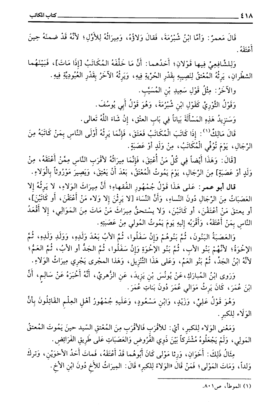 قَالَ أَبُو عُمَرَ عَلَى هَذَا قَوْلُ جُمْهُورِ الْفُقَهَاءِ أَنَّ مِيرَاثَ الْوَلَاءِ لَا يَرِثُهُ إِلَّا الْعَصَبَاتُ مِنَ الرِّجَالِ دُونَ النِّسَاءِ وَأَنَّ النِّسَاءَ لَا يَرِثْنَ إِلَّا وَلَاءَ مَنْ أَعْتَقْنَ أَوْ كَاتَبْنَ أَوْ يُعْتَقُ مَنْ أَعْتَقْنَ أَوْ كَاتَبْنَ وَلَا يَسْتَحِقُّ مِيرَاثَ مَنْ مَاتَ مِنَ الْمَوَالِي إِلَّا أَقْعَدُ النَّاسِ بِمَنْ أَعْتَقَهُ واقربه إِلَيْهِ يَوْمَ يَمُوتُ الْمُولِي مِنْ عَصَبَتِهِ