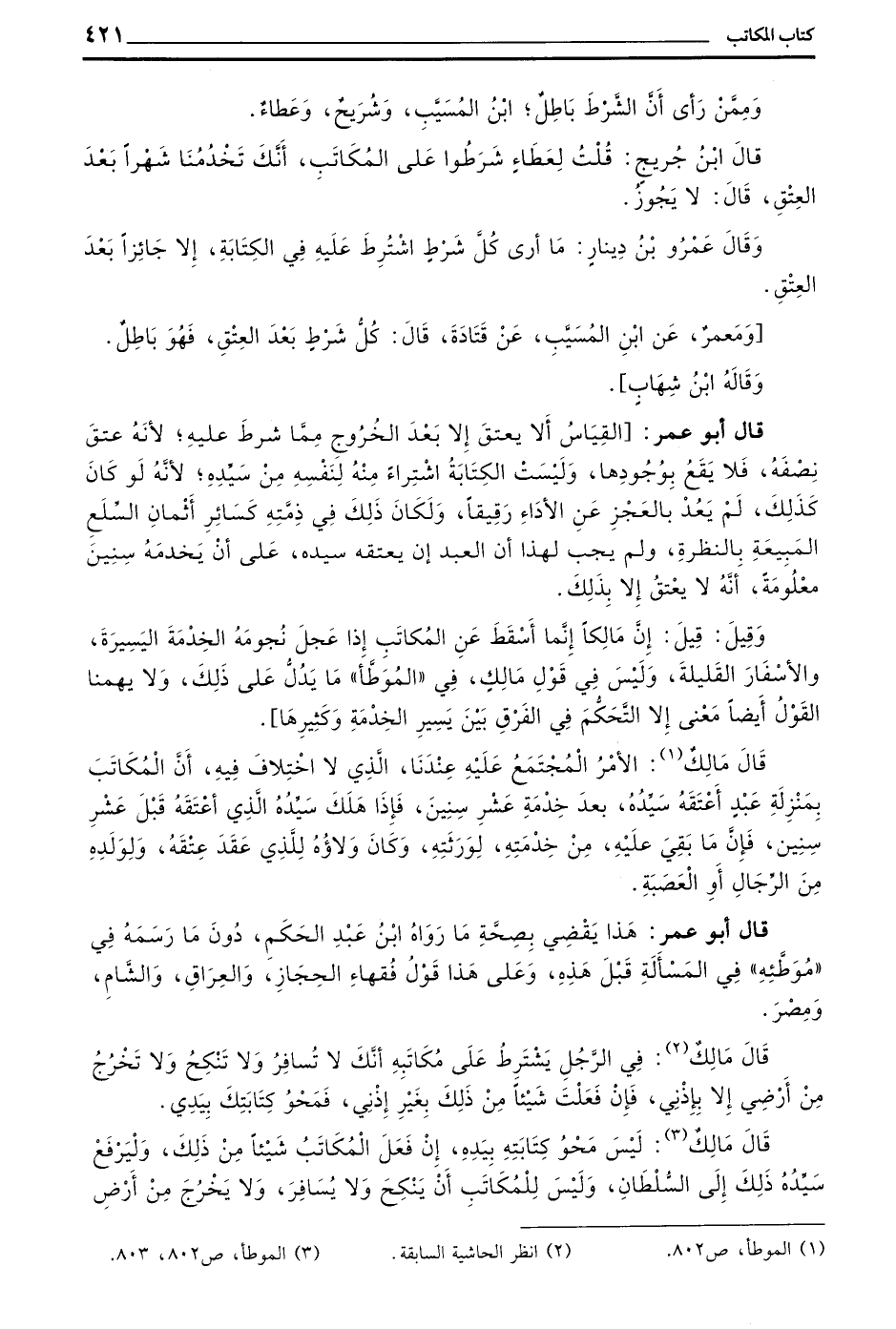قَالَ أَبُو عُمَرَ الْقِيَاسُ أَلَّا يَعْتِقَ إِلَّا بَعْدَ الْخُرُوجِ مِمَّا شَرَطَ عَلَيْهِ لِأَنَّهُ عَتَقَ نِصْفَهُ فَلَا يَقَعُ بِوُجُودِهَا وَلَيْسَتِ الْكِتَابَةُ اشْتِرَاءً مِنْهُ لِنَفْسِهِ مِنْ سَيِّدِهِ لِأَنَّهُ لَوْ كَانَ كَذَلِكَ لَمْ يَعُدْ بِالْعَجْزِ عَنِ الْأَدَاءِ رَقِيقًا وَلَكَانَ ذَلِكَ فِي ذِمَّتِهِ كَسَائِرِ أَثْمَانِ السلع المبيعة بالنظرة ولم يجب لهذا ان الْعَبْدِ أَنْ يُعْتِقَهُ سَيِّدُهُ عَلَى أَنْ يَخْدِمَهُ سِنِينَ مَعْلُومَةً أَنَّهُ لَا يَعْتِقُ إِلَّا بِذَلِكَ