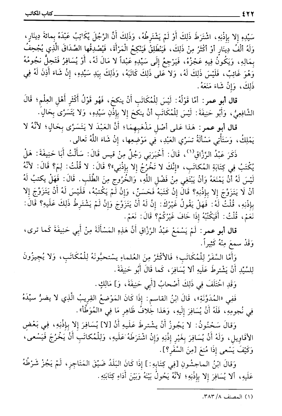 وَأَمَّا السَّفَرُ لِلْمُكَاتَبِ فَالْأَكْثَرُ مِنَ الْعُلَمَاءِ يَسْتَحِبُّونَهُ لِلْمُكَاتَبِ وَلَا يُجِيزُونَ لِلسَّيِّدِ أَنْ يَشْتَرِطَ عَلَيْهِ أَلَّا يُسَافِرَ كَمَا قَالَ أَبُو حَنِيفَةَ