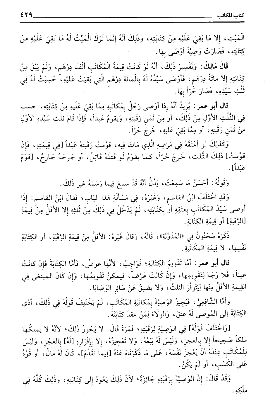 وَقَدِ اختلف بن الْقَاسِمِ وَغَيْرُهُ فِي مَسْأَلَةِ هَذَا الْبَابِ فَقَالَ بن الْقَاسِمِ إِذَا أَوْصَى سَيِّدُ الْمُكَاتَبِ بِعِتْقِهِ أَوْ بِكِتَابَتِهِ لَمْ يَدْخُلْ فِي ذَلِكَ مِنْ ثُلُثِهِ إِلَّا الْأَقَلُّ مِنْ قِيمَةِ الرَّقَبَةِ أَوْ قِيمَةِ الكتابة