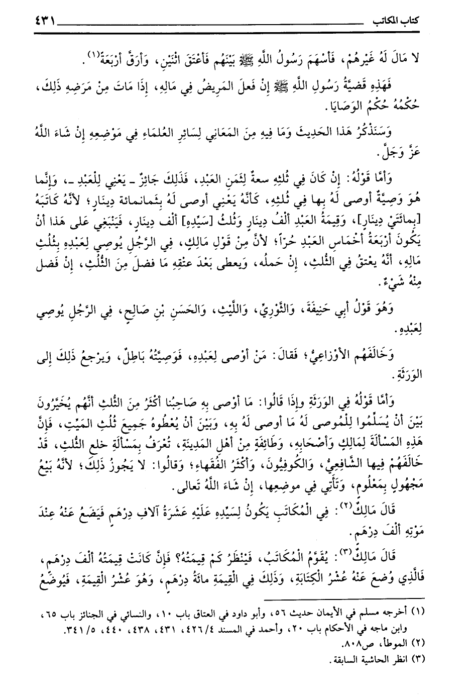 وَأَمَّا قَوْلُهُ إِنْ كَانَ فِي ثُلُثِهِ سَعَةٌ لِثَمَنِ الْعَبْدِ فَذَلِكَ جَائِزٌ - يَعْنِي لِلْعَبْدِ - وَإِنَّمَا هُوَ وَصِيَّةٌ أَوْصَى لَهُ بِهَا فِي ثُلُثِهِ كَأَنَّهُ يَعْنِي أَوْصَى لَهُ بِثَمَانِمِائَةِ دِينَارٍ لِأَنَّهُ كَاتَبَهُ بِمِائَتَيْ دِينَارٍ وَقِيمَةُ الْعَبْدِ أَلْفُ دِينَارٍ وَثُلُثُ سَيِّدِهِ أَلْفُ دِينَارٍ فَيَنْبَغِي عَلَى هَذَا أَنْ يَكُونَ أَرْبَعَةُ أَخْمَاسِ الْعَبْدِ حُرًّا لِأَنَّ مِنْ قَوْلِ مَالِكٍ فِي الرَّجُلِ يُوصِي لِعَبْدِهِ بِثُلُثِ مَالِهِ أَنَّهُ يَعْتِقُ فِي الثُّلُثِ إِنْ حَمَلَهُ وَيُعْطِي بَعْدَ عِتْقِهِ مَا فَضَلَ مِنَ الثُّلُثِ إِنْ فَضَلَ مِنْهُ شَيْءٌ