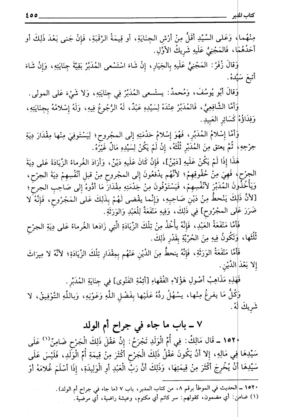 1520 - قَالَ مَالِكٌ فِي أُمِّ الْوَلَدِ تُجْرَحُ إِنَّ عَقْلَ ذَلِكَ الْجُرْحِ ضَامِنٌ عَلَى سَيِّدِهَا فِي مَالِهِ إِلَّا أَنْ يَكُونَ عَقْلُ ذَلِكَ الْجُرْحِ أَكْثَرَ مِنْ قِيمَةِ أُمِّ الْوَلَدِ فَلَيْسَ عَلَى سَيِّدِهَا أَنْ يُخْرِجَ أَكْثَرَ مِنْ قيمتها وذلك ان رب العبد او الوليدة إِذَا أَسْلَمَ غُلَامَهُ أَوْ