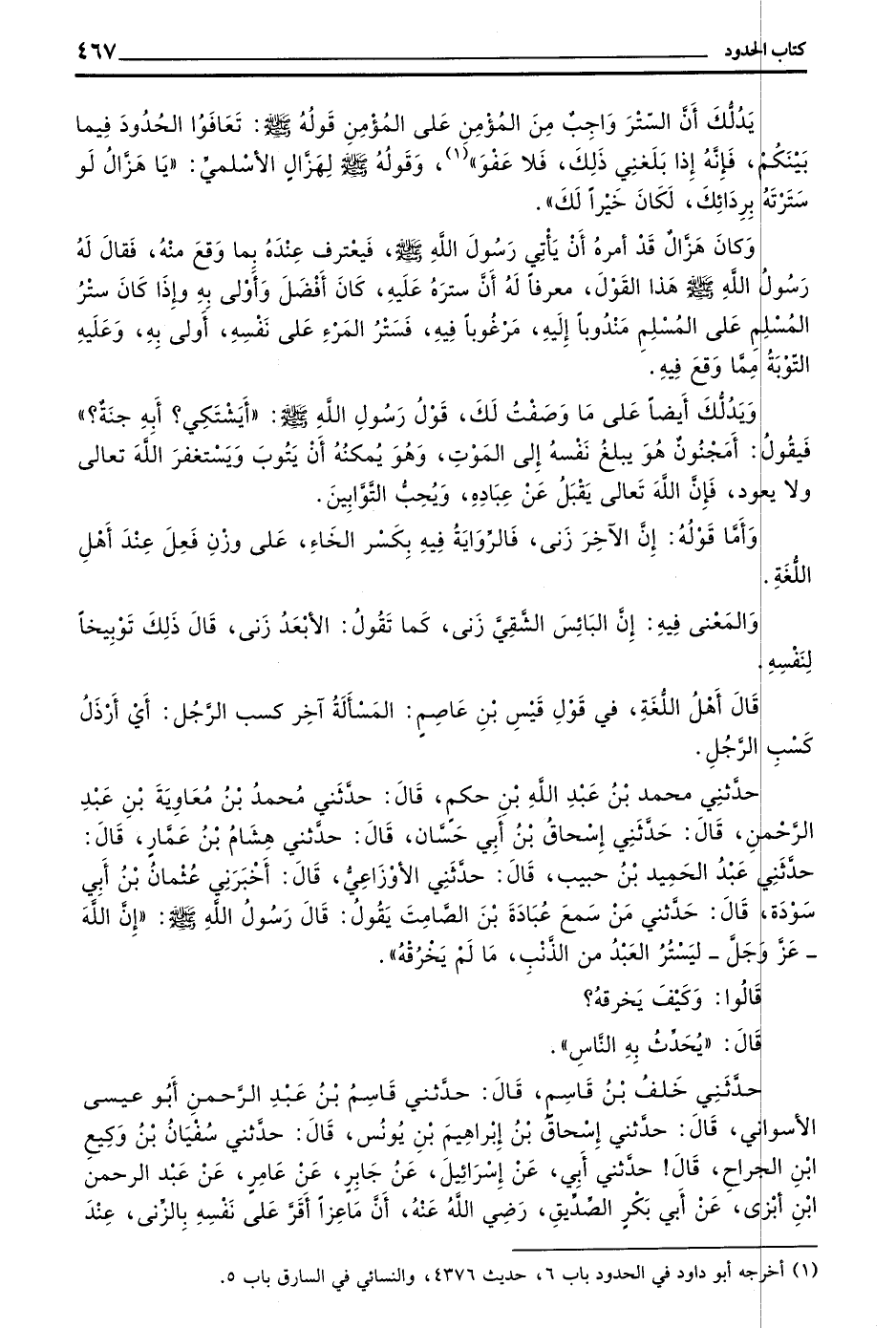 يدلك أَنَّ السَّتْرَ وَاجِبٌ مِنَ الْمُؤْمِنِ عَلَى الْمُؤْمِنِ قَوْلُهُ - صَلَّى اللَّهُ عَلَيْهِ وَسَلَّمَ تَعَافَوُا الْحُدُودَ فِيمَا بَيْنَكُمْ فَإِنَّهُ إِذَا بَلَغَنِي ذَلِكَ فَلَا عَفْوَ) وَقَوْلُهُ صَلَّى اللَّهُ عَلَيْهِ وَسَلَّمَ لِهَزَّالٍ الْأَسْلَمِيِّ (يَا هَزَّالُ لَوْ سَتَرْتَهُ بِرِدَائِكَ لَكَانَ خَيْرًا لَكَ)