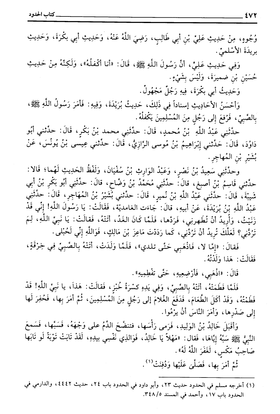 فَلَمَّا فَطَمَتْهُ أَتَتْهُ بِالصَّبِيِّ وَفِي يَدِهِ كِسْرَةُ خُبْزٍ فَقَالَتْ هَذَا يَا نَبِيَّ اللَّهِ! قَدْ فَطَمْتُهُ وَقَدْ أَكَلَ الطَّعَامَ فَدَفَعَ الْغُلَامَ إِلَى رَجُلٍ مِنَ الْمُسْلِمِينَ ثُمَّ أَمَرَ بِهَا فَحُفِرَ لَهَا إِلَى صَدْرِهَا وَأَمَرَ النَّاسَ أَنْ يَرْمُوا