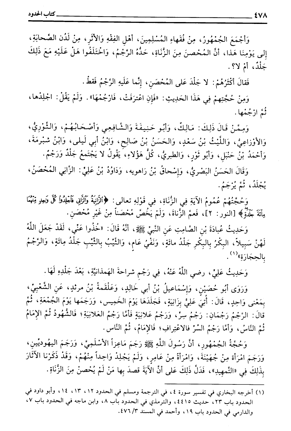 وَأَجْمَعَ الْجُمْهُورُ مِنْ فُقَهَاءِ الْمُسْلِمِينَ أَهْلِ الْفِقْهِ وَالْأَثَرِ مِنْ لَدُنِ الصَّحَابَةِ إِلَى يَوْمِنَا هَذَا أَنَّ الْمُحْصَنَ مِنَ الزُّنَاةِ حَدُّهُ الرَّجْمُ وَاخْتَلَفُوا هَلْ عَلَيْهِ مَعَ ذَلِكَ جَلْدٌ أَمْ لَا
