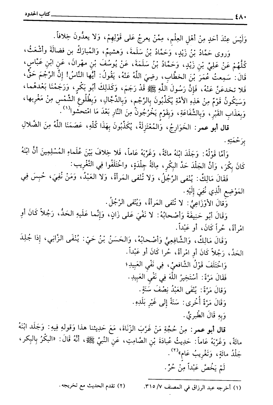 وَرَوَى حَمَّادُ بْنُ زَيْدٍ وَحَمَّادُ بْنُ سَلَمَةَ وَهُشَيْمٌ وَالْمُبَارَكُ بْنُ فَضَالَةَ وَأَشْعَثُ كُلُّهُمْ عَنْ عَلِيِّ بْنِ زَيْدٍ وَحَمَّادِ بْنِ سَلَمَةَ عَنْ يُوسُفَ بن مهران عن بن عَبَّاسٍ قَالَ سَمِعْتُ عُمَرَ بْنَ الْخَطَّابِ رَضِيَ اللَّهُ عَنْهُ يَقُولُ أَيُّهَا النَّاسُ! إِنَّ الرَّجْمَ حَقٌّ فَلَا تُخْدَعُنَّ عَنْهُ فَإِنَّ رَسُولَ اللَّهِ صَلَّى اللَّهُ عَلَيْهِ وَسَلَّمَ قَدْ رَجَمَ وَكَذَلِكَ أَبُو بَكْرٍ وَرَجَمْنَا بَعْدَهُمَا وَسَيَكُونُ قَوْمٌ مِنْ هَذِهِ الْأُمَّةِ يُكَذِّبُونَ بِالرَّجْمِ وَبِالدَّجَّالِ وَبِطُلُوعِ الشَّمْسِ مِنْ مَغْرِبِهَا وَبِعَذَابِ الْقَبْرِ وَبِالشَّفَاعَةِ وَبِقَوْمٍ يَخْرُجُونَ مِنَ النَّارِ بَعْدَ مَا امْتُحِشُوا