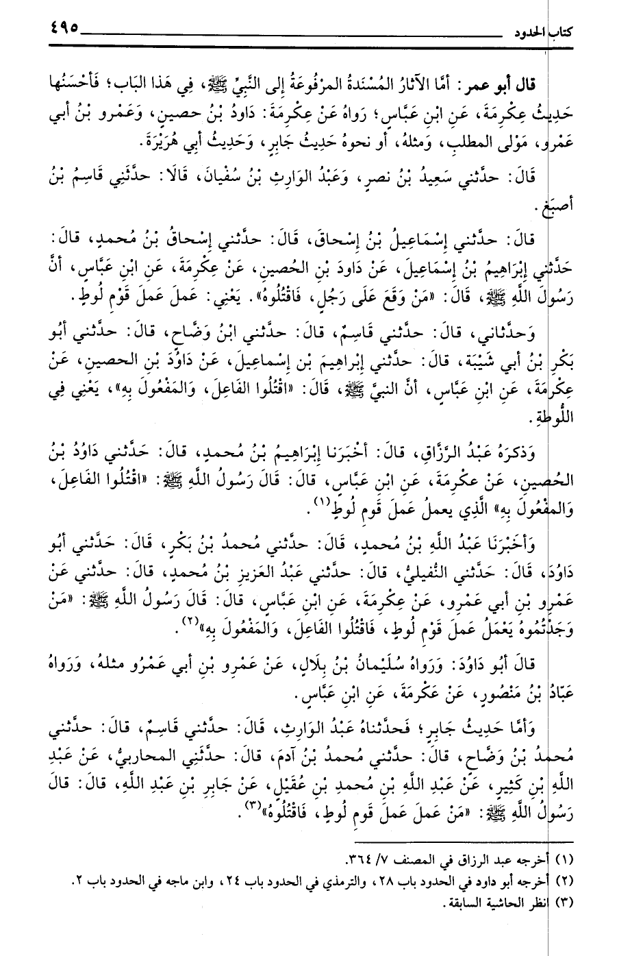 وَأَمَّا حَدِيثُ جَابِرٍ فَحَدَّثَنَاهُ عَبْدُ الْوَارِثِ قَالَ حَدَّثَنِي قَاسِمٌ قَالَ حَدَّثَنِي مُحَمَّدُ بْنُ وَضَّاحٍ قَالَ حَدَّثَنِي مُحَمَّدُ بْنُ آدَمَ قَالَ حَدَّثَنِي الْمُحَارِبِيُّ عَنْ عَبْدِ اللَّهِ بْنِ كَثِيرٍ عَنْ عَبْدِ اللَّهِ بْنِ مُحَمَّدِ بْنِ عَقِيلٍ عَنْ جَابِرِ بْنِ عَبْدِ اللَّهِ قَالَ قَالَ رَسُولُ اللَّهِ صَلَّى اللَّهُ عَلَيْهِ وسلم (من عَمِلَ عَمَلَ قَوْمِ لُوطٍ فَاقْتُلُوهُ