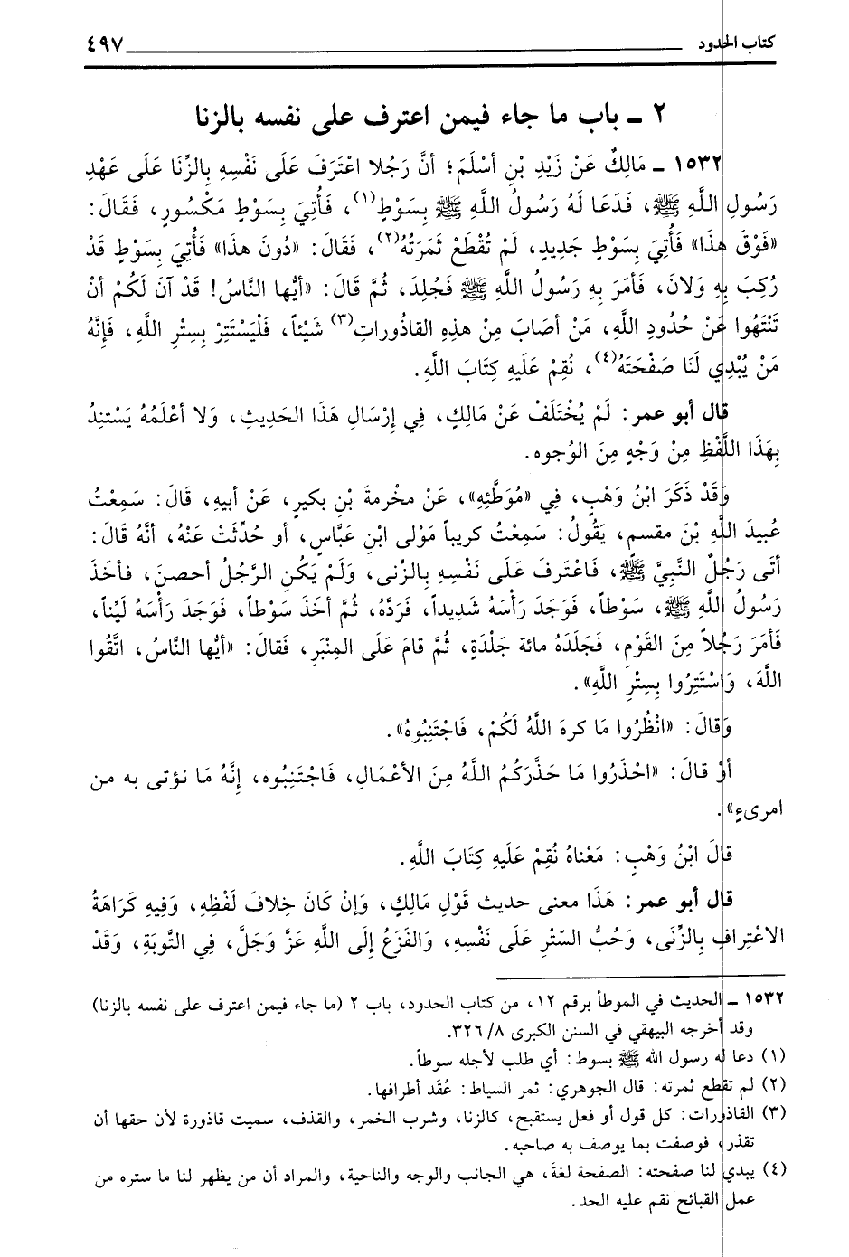 1532 - مَالِكٌ عَنْ زَيْدِ بْنِ أَسْلَمَ أَنَّ رَجَلًا اعترف على نفسه بالزنى عَلَى عَهْدِ رَسُولِ اللَّهِ صَلَّى اللَّهُ عَلَيْهِ وَسَلَّمَ فَدَعَا لَهُ رَسُولُ اللَّهِ صَلَّى اللَّهُ عَلَيْهِ وَسَلَّمَ بِسَوْطٍ فَأُتِيَ بِسَوْطٍ مَكْسُورٍ فَقَالَ (فَوْقَ هَذَا) فَأُتِيَ بِسَوْطٍ جَدِيدٍ لَمْ تُقْطَعْ ثَمَرَتُهُ فَقَالَ (دُونَ هَذَا) فَأُتِيَ بِسَوْطٍ قَدْ رُكِبَ بِهِ وَلَانَ فَأَمَرَ بِهِ رَسُولُ اللَّهِ صَلَّى اللَّهُ عَلَيْهِ وَسَلَّمَ فَجُلِدَ ثُمَّ قَالَ (أَيُّهَا النَّاسُ! قَدْ آنَ لَكُمْ أَنْ تَنْتَهُوا عَنْ حُدُودِ اللَّهِ مَنْ أَصَابَ مِنْ هَذِهِ الْقَاذُورَاتِ (3) شَيْئًا فَلْيَسْتَتِرْ بِسَتْرِ اللَّهِ فَإِنَّهُ مَنْ يُبْدِي لَنَا صَفْحَتَهُ نُقِمْ عَلَيْهِ كِتَابَ اللَّهِ