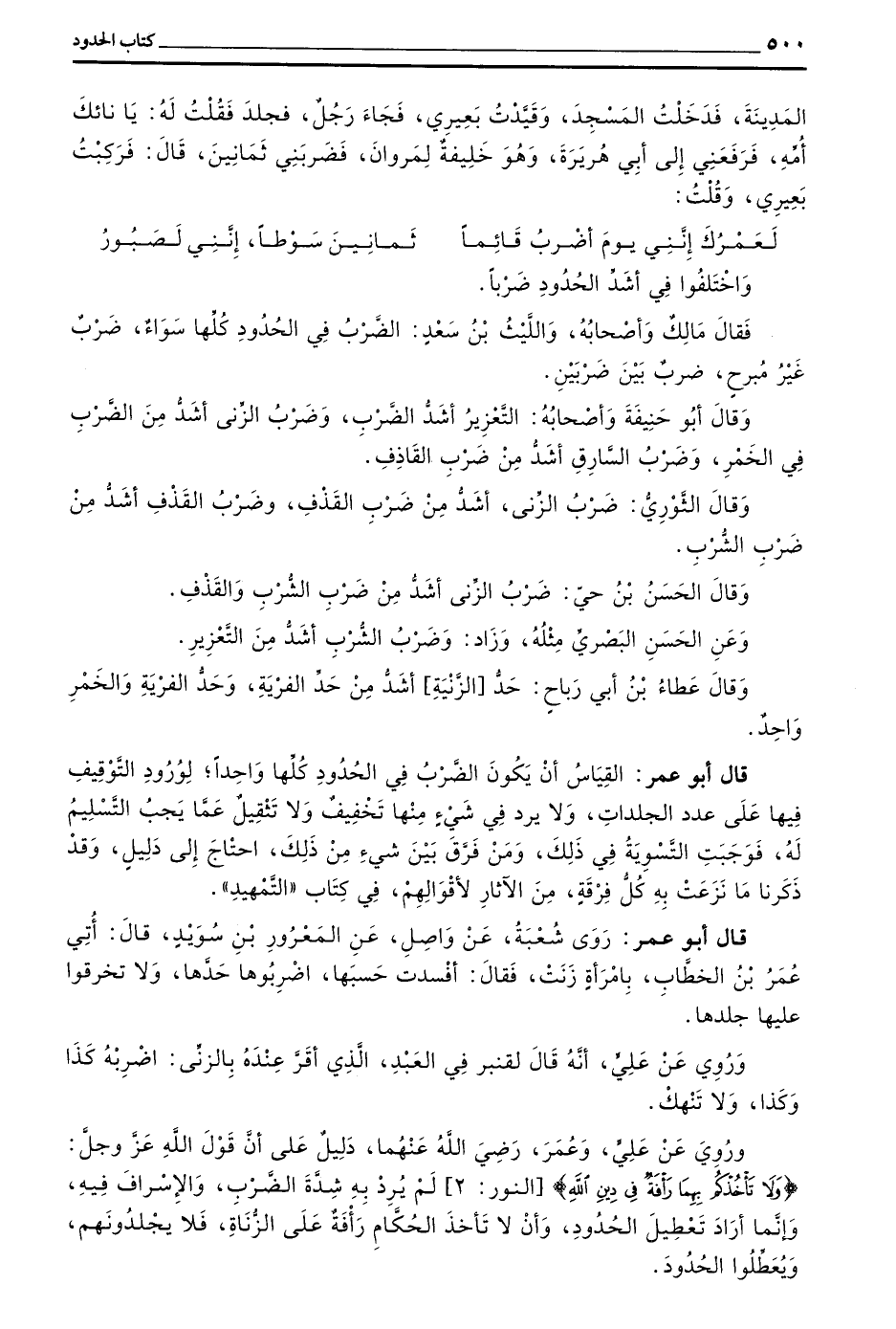 وَرُوِيَ عَنْ عَلِيٍّ وَعُمَرَ رَضِيَ اللَّهُ عَنْهُمَا دَلِيلٌ عَلَى أَنَّ قَوْلَ اللَّهِ عَزَّ وَجَلَّ (وَلَا تَأْخُذْكُمْ بِهِمَا رَأْفَةٌ فِي دِينِ اللَّهِ) النُّورِ 2 لَمْ يُرِدْ بِهِ شِدَّةَ الضَّرْبِ وَالْإِسْرَافَ فِيهِ وَإِنَّمَا أَرَادَ تَعْطِيلَ الْحُدُودِ وَأَنْ لَا تَأْخُذَ الْحُكَّامَ رَأْفَةٌ عَلَى الزُّنَاةِ فَلَا يَجْلِدُونَهُمْ وَيُعَطِّلُوا الْحُدُودَ