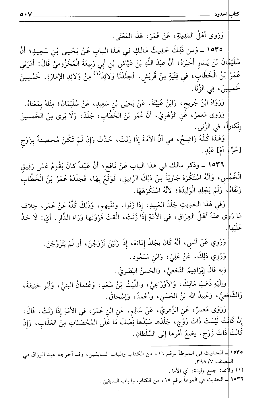 1535 - وَمِنْ ذَلِكَ حَدِيثُ مَالِكٌ فِي هَذَا الْبَابِ عَنْ يَحْيَى بْنِ سَعِيدٍ أَنَّ سُلَيْمَانَ بْنَ يَسَارٍ أَخْبَرَهُ إِنَّ عَبْدَ اللَّهِ بْنَ عَيَّاشِ بْنِ أَبِي رَبِيعَةَ الْمَخْزُومِيَّ قَالَ أَمَرَنِي عُمَرُ بْنُ الْخَطَّابِ فِي فِتْيَةٍ مِنْ قُرَيْشٍ فَجَلَدْنَا وَلَائِدَ مِنْ وَلَائِدِ الْإِمَارَةِ خَمْسِينَ خَمْسِينَ فِي الزنى