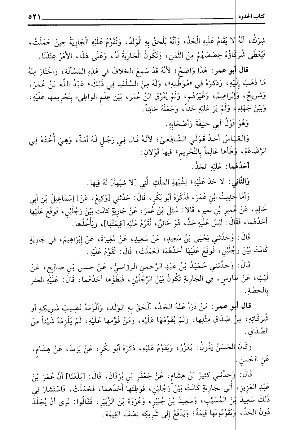 واما حديث بن عُمَرَ فَذَكَرَهُ أَبُو بَكْرٍ قَالَ حَدَّثَنِي وَكِيعٌ عَنْ إِسْمَاعِيلَ بْنِ أَبِي خَالِدٍ عَنْ عُمَيْرِ بن نمير قالا سئل بن عُمَرَ عَنْ جَارِيَةٍ كَانَتْ بَيْنَ رَجُلَيْنِ فَوَقَعَ عَلَيْهَا أَحَدُهُمَا فَقَالَ لَيْسَ عَلَيْهِ حَدٌّ هُوَ خَائِنٌ تُقَوَّمُ عَلَيْهِ قِيمَتُهَا وَيَأْخُذُهَا