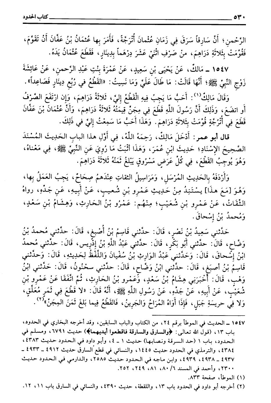 قَالَ أَبُو عُمَرَ أَدْخَلَ مَالِكٌ رَحِمَهُ اللَّهُ فِي أَوَّلِ هَذَا الْبَابِ الْحَدِيثَ الْمُسْنَدَ الصَّحِيحَ الاسناد حديث بن عُمَرَ وَهَذَا أَثْبَتُ مَا رُوِيَ عَنِ النَّبِيِّ صَلَّى اللَّهُ عَلَيْهِ وَسَلَّمَ فِي مَعْنَاهُ وَهُوَ يُوجِبُ الْقَطْعَ فِي كُلِّ عَرْضٍ مَسْرُوقٍ يَبْلُغُ ثَمَنُهُ ثَلَاثَةَ دَرَاهِمَ
