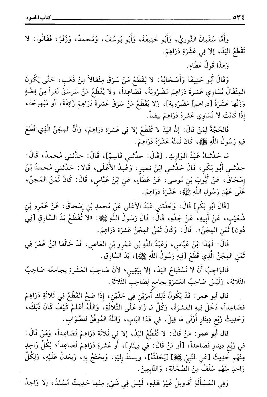 قَالَ أَبُو عُمَرَ مَنْ قَالَ لَا تُقْطَعُ الْيَدُ إِلَّا فِي ثَلَاثَةِ دَرَاهِمَ فَصَاعِدًا وَمَنْ قَالَ فِي رُبُعِ دِينَارٍ فَصَاعِدًا أَوْ مَنْ قَالَ فِي دِينَارٍ أَوْ عَشَرَةِ دَرَاهِمَ فَصَاعِدًا لِكُلِّ وَاحِدٍ مِنْهُمْ حَدِيثٍ عَنِ النَّبِيِّ صَلَّى اللَّهُ عَلَيْهِ وَسَلَّمَ يحدثه ويسند إليه ويحتج به ويعدل عَلَيْهِ وَلِكُلِّ وَاحِدٍ مِنْهُمْ سَلَفٌ مِنَ الصَّحَابَةِ وَالتَّابِعِينَ