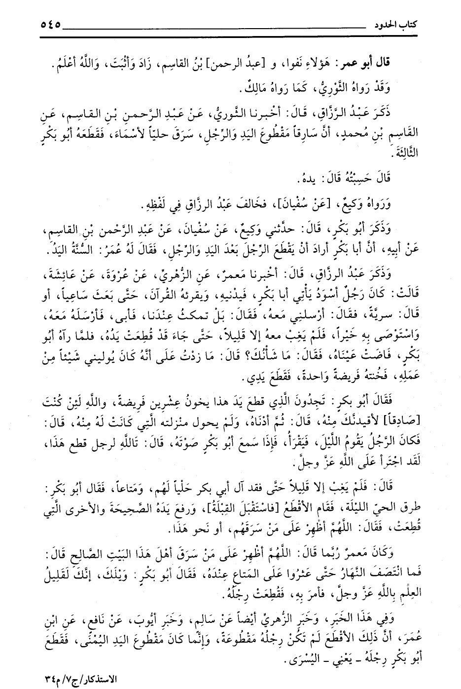 ذَكَرَ عَبْدُ الرَّزَّاقِ قَالَ أَخْبَرَنَا الثَّوْرِيُّ عَنْ عَبْدِ الرَّحْمَنِ بْنِ الْقَاسِمِ عَنِ الْقَاسِمِ بْنِ مُحَمَّدٍ أَنَّ سَارِقًا مَقْطُوعَ الْيَدِ وَالرِّجْلِ سَرَقَ حُلِيًّا لِأَسْمَاءَ فَقَطَعَهُ أَبُو بَكْرٍ الثَّالِثَةَ