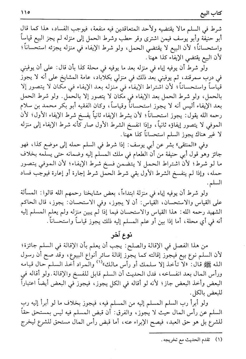 من هذا الفصل في الإقالة والصلح: يجب أن يعلم بأن الإقالة في السلم جائزة؛ لأن السلم نوع بيع فيجوز إقالته كما يجوز إقالة سائر أنواع البيوع، وقد صح أن رسول الله صلى الله عليه وسلّمقال: «لا تأخذ إلا سلمك أو رأس مالك» والمراد أخذ السلم حال قيامه ورأس المال بعد انفساخه، فدل الحديث أن السلم قابل للفسخ والإقالة. ولو أقاله في البعض وأخذ البعض جاز؛ لأنه لو أقاله في الكل يجوز، فيجوز في البعض أيضاً اعتباراً للبعض بالكل.