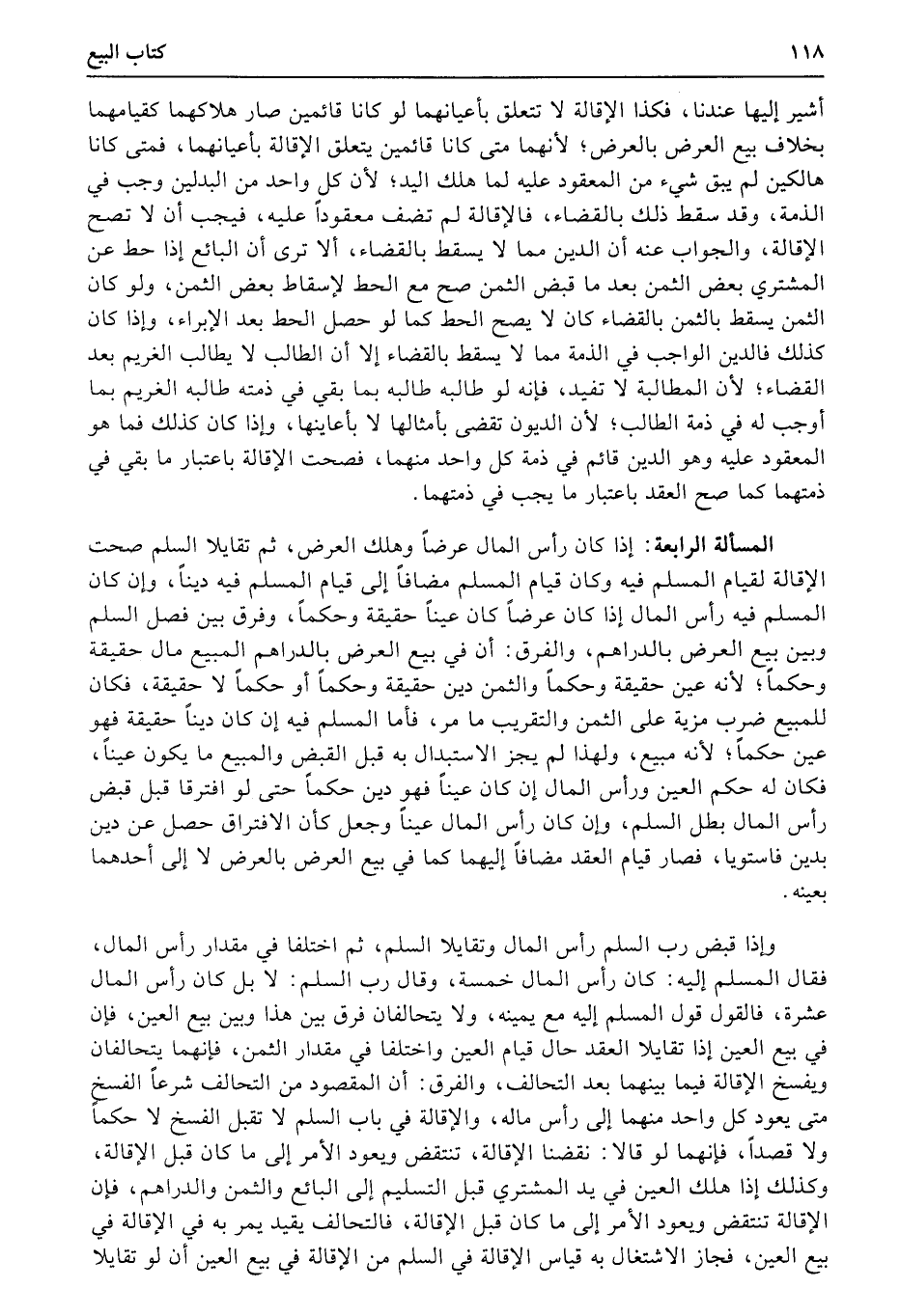 المسألة الرابعة: إذا كان رأس المال عرضاً وهلك العرض، ثم تقايلا السلم صحت الإقالة لقيام المسلم فيه وكان قيام المسلم مضافاً إلى قيام المسلم فيه ديناً، وإن كان المسلم فيه رأس المال إذا كان عرضاً كان عيناً حقيقة وحكماً، وفرق بين فصل السلم وبين بيع العرض بالدراهم، والفرق: أن في بيع العرض بالدراهم المبيع مال حقيقة وحكماً؛ لأنه عين حقيقة وحكماً والثمن دين حقيقة وحكماً أو حكماً لا حقيقة، فكان للمبيع ضرب مزية على (الثمن) والتقريب ما مر، فأما المسلم فيه إن كان ديناً حقيقة فهو عين حكماً؛ لأنه مبيع، ولهذا لم يجز الاستبدال به قبل القبض والمبيع ما يكون عيناً، فكان له حكم العين ورأس المال إن كان عيناً فهو دين حكماً حتى لو افترقا قبل قبض رأس المال بطل السلم، وإن كان رأس (المال) عيناً وجعل كأن الافتراق حصل عن دين بدين فاستويا، فصار قيام العقد مضافاً إليهما كما في بيع العرض بالعرض لا إلى أحدهما بعينه.