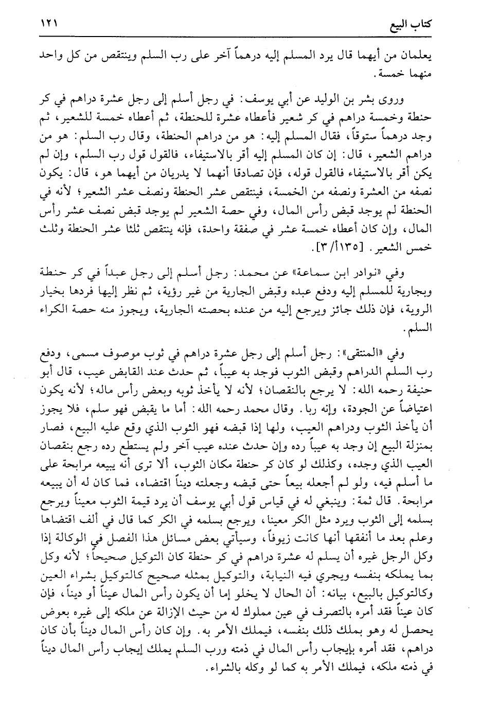 وفي «المنتقى» : رجل أسلم إلى رجل عشرة دراهم في ثوب موصوف مسمى، ودفع رب السلم الدراهم وقبض الثوب فوجد به عيباً، ثم حدث عند القابض عيب، قال أبو حنيفة رحمه الله: لا يرجع بالنقصان؛ لأنه لا يأخذ ثوبه وبعض رأس ماله؛ لأنه يكون اعتياضاً عن الجودة، وإنه ربا. وقال محمد رحمه الله: أما ما يقبض فهو سلم، فلا يجوز أن يأخذ الثوب ودراهم العيب، ولها إذا قبضه فهو الثوب الذي وقع عليه البيع، فصار بمنزلة البيع إن وجد به عيباً رده وإن حدث عنده عيب آخر ولم يستطع رده رجع بنقصان العيب الذي وجده، وكذلك لو كان كر حنطة مكان الثوب، ألا ترى أنه يبيعه مرابحة على ما أسلم فيه، ولو لم أجعله بيعاً حتى قبضه وجعلته ديناً اقتضاه، فما كان له أن يبيعه مرابحة. قال ثمة: وينبغي له في قياس قول أبي يوسف أن يرد قيمة الثوب معيناً ويرجع بسلمه إلى الثوب ويرد مثل الكر معينا، ويرجع بسلمه في الكر كما قال في ألف اقتضاها وعلم بعد ما أنفقها أنها كانت زيوفاً، وسيأتي بعض مسائل هذا الفصل في الوكالة إذا وكل الرجل غيره أن يسلم له عشرة دراهم في كر حنطة كان التوكيل صحيحاً؛ لأنه وكل بما يملكه بنفسه ويجري فيه النيابة، والتوكيل بمثله صحيح كالتوكيل بشراء العين وكالتوكيل بالبيع، بيانه: أن الحال لا يخلو إما أن يكون رأس المال عيناً أو ديناً، فإن كان عيناً فقد أمره بالتصرف في عين مملوك له من حيث الإزالة عن ملكه إلى غيره بعوض يحصل له وهو بملك ذلك بنفسه، فيملك الأمر به. وإن كان رأس المال ديناً بأن كان دراهم، فقد أمره بإيجاب رأس المال في ذمته ورب السلم يملك إيجاب رأس المال ديناً في ذمته ملكه، فيملك الأمر به كما لو وكله بالشراء.