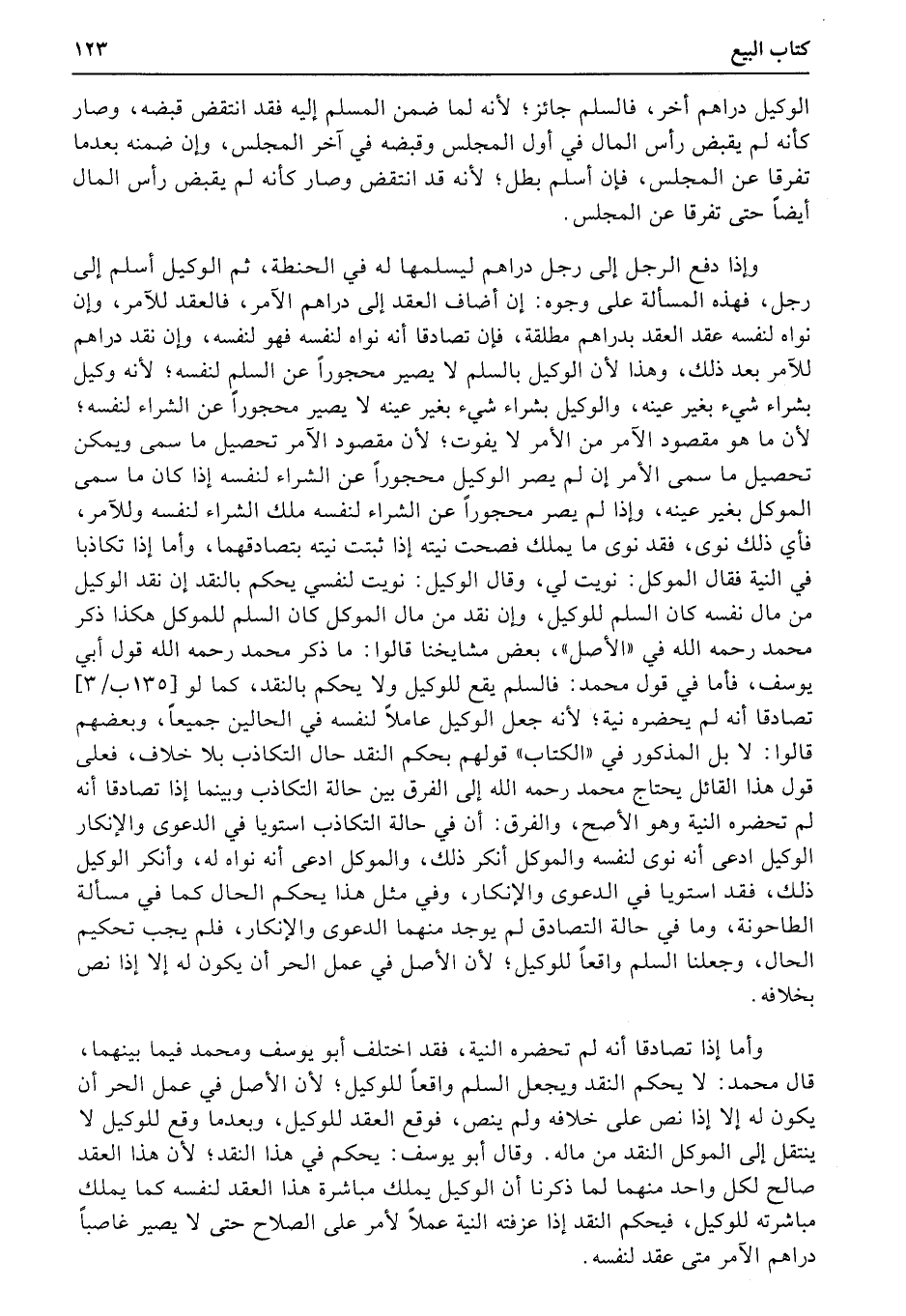 وأما إذا تصادقا أنه لم تحضره النية، فقد اختلف أبو يوسف ومحمد فيما بينهما، قال محمد: لا يحكم النقد ويجعل السلم واقعاً للوكيل؛ لأن الأصل في عمل الحر أن يكون له إلا إذا نص على خلافه ولم ينص، فوقع العقد للوكيل، وبعدما وقع للوكيل لا ينتقل إلى الموكل النقد من ماله. وقال أبو يوسف: يحكم في هذا النقد؛ لأن هذا العقد صالح لكل واحد منهما لما ذكرنا أن الوكيل يملك مباشرة هذا العقد لنفسه كما يملك مباشرته للوكيل، فيحكم النقد إذا عزفته النية عملاً لأمر على الصلاح حتى لا يصير غاصباً دراهم الآمر متى عقد لنفسه.