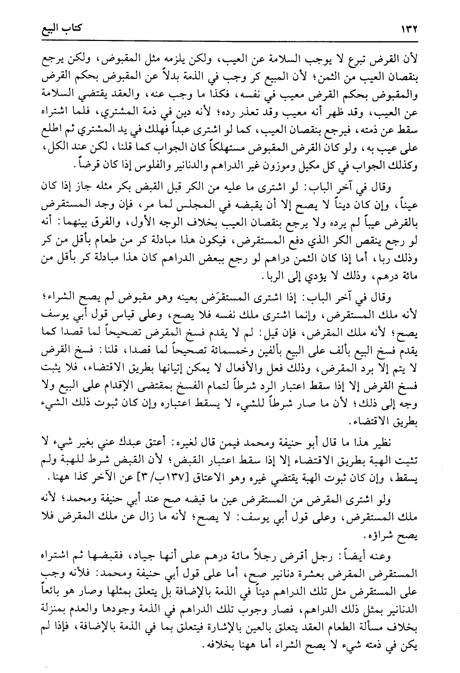 وقال في آخر الباب: لو اشترى ما عليه من الكر (قبل) القبض بكر مثله جاز إذا كان عيناً، وإن كان ديناً لا يصح إلا أن يقبضه في المجلس لما مر، فإن وجد المستقرض بالقرض عيباً لم يرده ولا يرجع بنقصان العيب بخلاف الوجه الأول، والفرق بينهما: أنه لو رجع ينقص الكر الذي دفع المستقرض، فيكون هذا مبادلة كر من طعام بأقل من كر وذلك ربا، أما إذا كان الثمن دراهم لو رجع ببعض الدراهم كان هذا مبادلة كر بأقل من مائة درهم، وذلك لا يؤدي إلى الربا.