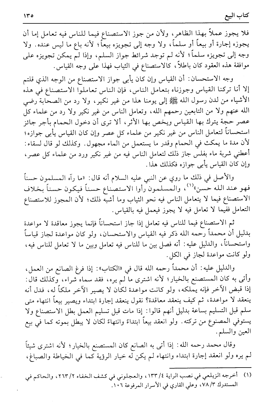 والأصل في ذلك ما روي عن النبي عليه السلام أنه قال: «ما رآه المسلمون حسناً فهو عند الله حسن» ، والمسلمون رأوا الاستصناع حسناً فيكون حسناً بخلاف الاستصناع فيما لا يتعامل الناس فيه نحو الثياب وما أشبه ذلك؛ لأن المجوز للاستصناع التعامل ففيما لا تعامل فيه لا يجوز فيعمل فيه بالقياس.