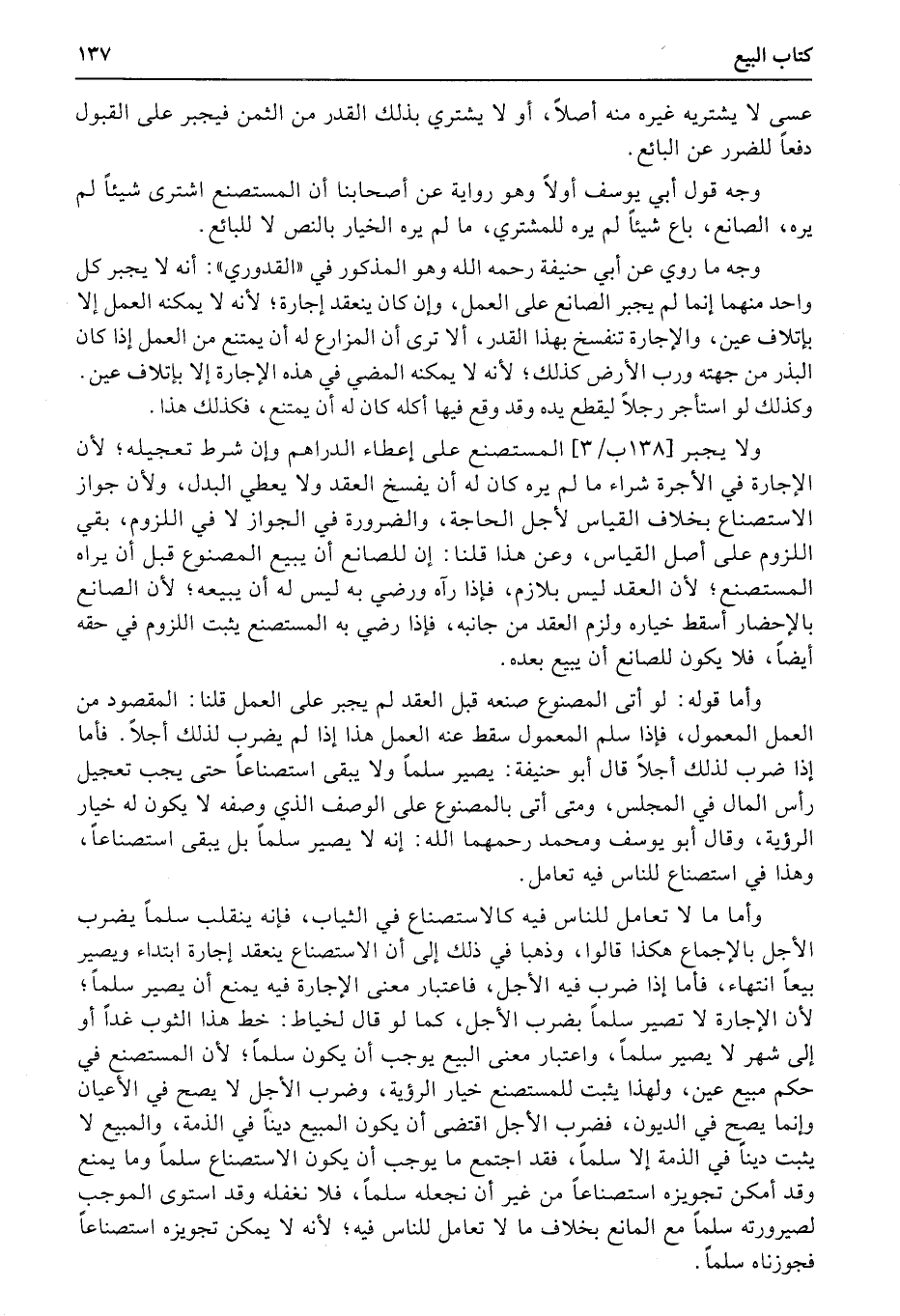 وأما ما لا تعامل للناس فيه كالاستصناع في الثياب، فإنه ينقلب سلماً يضرب الأجل بالإجماع هكذا قالوا، وذهبا في ذلك إلى أن الاستصناع ينعقد إجارة ابتداء ويصير بيعاً انتهاء، فأما إذا ضرب فيه الأجل، فاعتبار معنى الإجارة فيه يمنع أن يصير سلماً؛ لأن الإجارة لا تصير سلماً بضرب الأجل، كما (لو) قال لخياط: خط هذا الثوب غداً أو إلى شهر لا يصير سلماً، واعتبار معنى البيع يوجب أن يكون سلماً؛ لأن المستصنع في حكم مبيع عين، ولهذا يثبت للمستصنع خيار الرؤية، وضرب الأجل لا يصح في الأعيان وإنما يصح في الديون، فضرب الأجل اقتضى أن يكون المبيع ديناً في الذمة، والمبيع لا يثبت ديناً في الذمة إلا سلماً، فقد اجتمع ما يوجب أن يكون الاستصناع سلماً وما يمنع وقد أمكن تجويزه استصناعاً من غير أن نجعله سلماً، فلا نغفله وقد استوى الموجب لصيرورته سلماً مع المانع بخلاف ما لا تعامل للناس فيه؛ لأنه لا يمكن تجويزه استصناعاً فجوزناه سلماً.