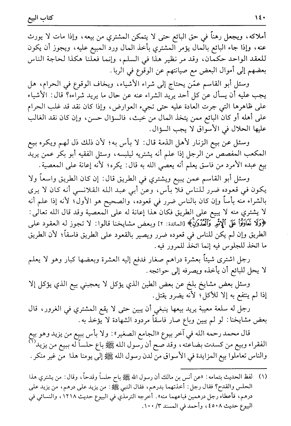 وسئل أبو القاسم عمّن يحتاج إلى شراء الأشياء، ويخاف الوقوع في الحرام، هل يجب عليه أن يسأل عن كل أحد يريد الشراء عنه عن حال ما يريد شراءه؟ قال: الأشياء على ظاهرها التي جرت العادة عليه حتى تجيء العوارض، وإذا كان نقد قد غلب الحرام على أهله أو كان البائع ممن يتخذ المال من خبث، فالسؤال حسن، وإن كان نقد الغالب عليها الحلال في الأسواق لا يجب السؤال.