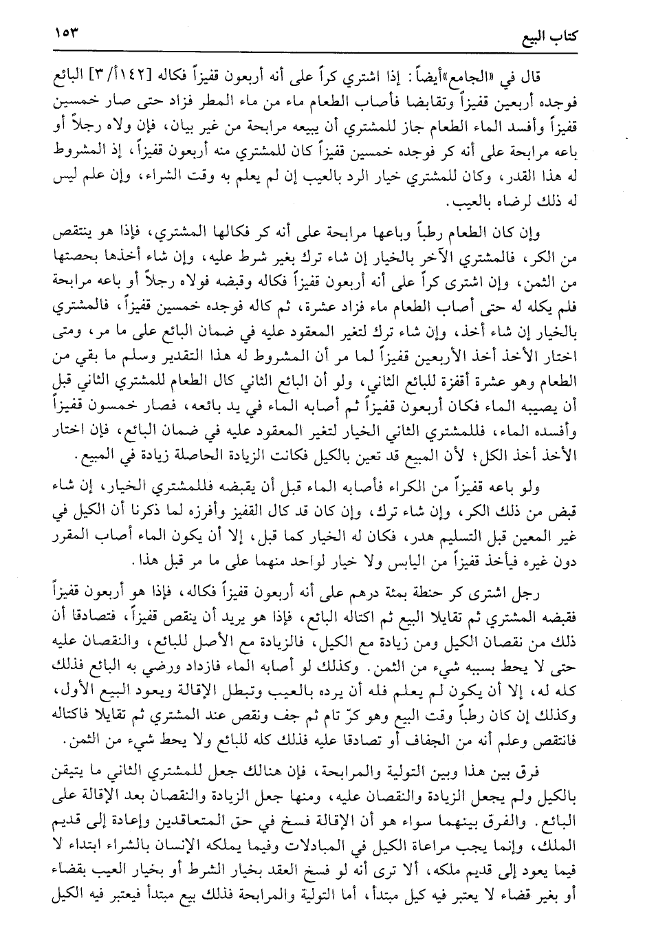 وإن كان الطعام رطباً وباعها مرابحة على أنه كر فكالها المشتري، فإذا هو ينتقص من الكر، فالمشتري الآخر بالخيار إن شاء ترك بغير شرط عليه، وإن شاء أخذها بحصتها من الثمن، وإن اشترى كراً على أنه أربعون قفيزاً فكاله وقبضه فولاه رجلاً أو باعه مرابحة فلم يكله له حتى أصاب الطعام ماء فزاد عشرة، ثم كاله فوجده خمسين قفيزاً، فالمشتري بالخيار إن شاء أخذ، وإن شاء ترك لتغير المعقود عليه في ضمان البائع على ما مر، ومتى اختار الأخذ أخذ الأربعين قفيراً لما مر أن المشروط له هذا التقدير وسلم ما بقي من الطعام وهو عشرة أقفزة للبائع الثاني، ولو أن البائع الثاني كال الطعام للمشتري الثاني قبل أن يصيبه الماء فكان أربعون قفيزاً ثم أصابه الماء في يد بائعه، فصار خمسون قفيزاً وأفسده الماء، فللمشتري الثاني الخيار لتغير المعقود عليه في ضمان البائع، فإن اختار الأخذ أخذ الكل؛ لأن المبيع قد تعين بالكيل فكانت الزيادة الحاصلة زيادة في المبيع.