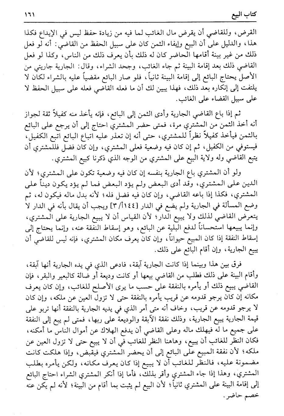 القرض، وللقاضي أن يقرض مال الغائب لما فيه من زيادة حفظ ليس في الإيداع فكذا هذا، والدليل على أن البيع وإيفاء الثمن كان على سبيل الحفظ من القاضي: أنه لو فعل ذلك من غير بينة أقامها الحاضر كان له ذلك بأن يعرف ذلك من الناس، وكذا لو فعل القاضي ذلك بعد إقامة البينة ثم جاء الغائب، وجحد الشراء، وقال: الجارية جاريتي من الأصل يحتاج البائع إلى إقامة البينة ثانياً، فلو صار البائع مقضياً عليه بالشراء لكان لا يلتفت إلى إنكاره بعد ذلك، فهذا يبين لك أن ما فعله القاضي فعله على سبيل الحفظ لا على سبيل القضاء على الغائب.