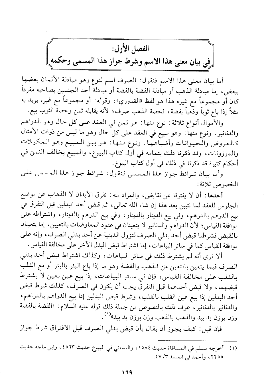 ألا ترى أنه لم يشترط ذلك في سائر البياعات، وكذلك اشتراط قبض أحد بدلي الصرف فيما يتعين بالتعين من الذهب والفضة وهو ما إذا باع البئر بالبئر أو مع القلب بالقلب على مخالفة القياس، فإن في سائر البياعات، إذا بيع عين بعين لا يشترط قبضهما، ولا قبض أحدهما قبل التفرق يجب أن يكون في الصرف، كذلك شرط قبض أحد البدلين إذا بيع عين القلب بالقلب، وشرط قبض البدلين إذا بيع الدراهم بالدراهم، والدنانير بالدنانير، عرف ذلك بالنصوص من جملة ذلك قوله عليه السلام: «الفضة بالفضة وزن بوزن يد بيد والذهب بالذهب وزن بوزن يد بيد» .