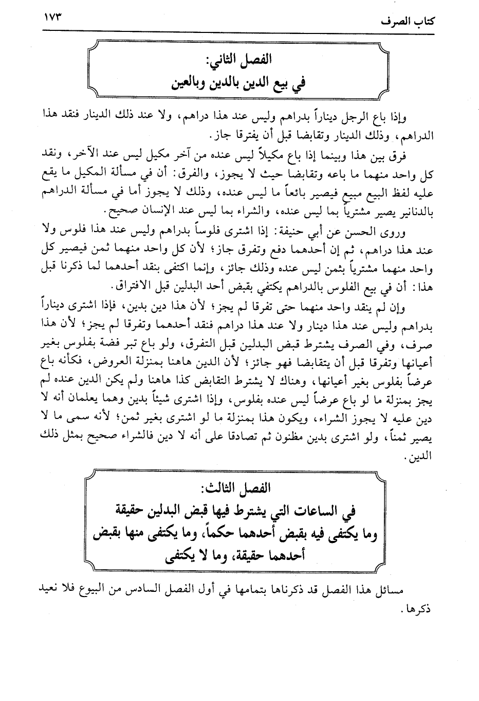 الفصل الثالث: في الساعات التي يشترط فيها قبض البدلين حقيقةوما يكتفي فيه بقبض أحدهما حكماً، وما يكتفي منها بقبض أحدهما حقيقة، وما لا يكتفي